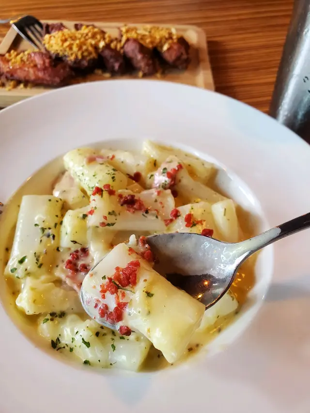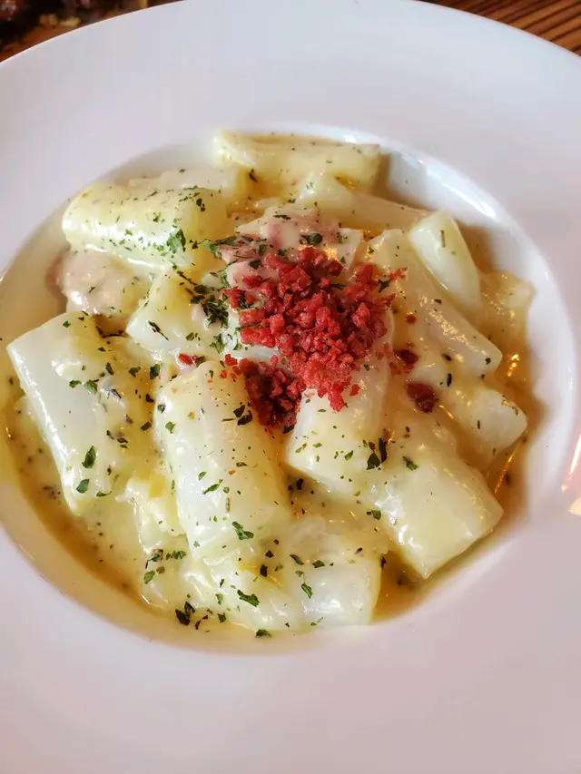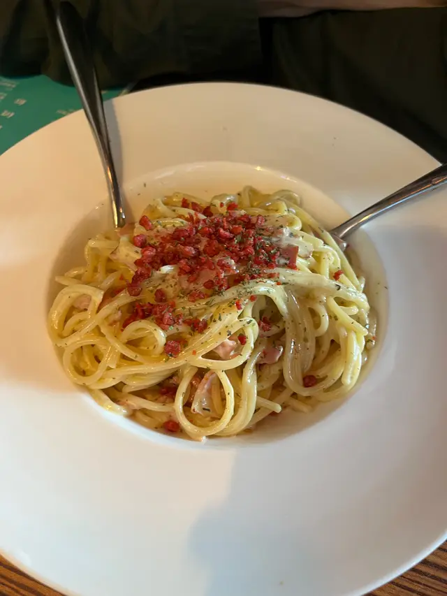 撇開煩惱,我喺這間店嘅食物體驗真係正到爆炸🔥!首先,嗰啲蜜糖雞翼🍗,包你食咗一啖就停唔到口,糖香烤焦得啱啱好,啖啖肉地道得滯。平時我唔食雞翼皮,但喺度,我竟然毫不猶豫咁大口大口撕啖;個皮脆到即刻融入你味蕾,味正到喊出嚟。食住雞翼,點可以少咗意粉?佢哋個卡邦尼意粉夠曬level⚡,入口就知道大廚手勢有幾叻,意粉煮得啱啱好,醬汁嘅濃郁香味配得絕妙無比,我同桌旁嘅朋友隻手快過隻手去夾,幾乎秒清盤!再嚟食個香蒜炒雜菌🍄,炒得香氣四溢,每一啖都吸飽咗濃濃蒜香,每啖菌都Q彈得嚟鮮味十足,唔油膩到哂嘴,啱到不得了!店裡面嘅氣氛bingo🎉,搭配埋以質量並重嘅食物,喺呢度食飯可以話係開心到飛起嚟。下次行過呢個區執定要再過嚟試多轉,換轉新口味,享受一下啲宜家少有嘅滿足感啦!👍…查看更多