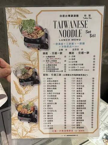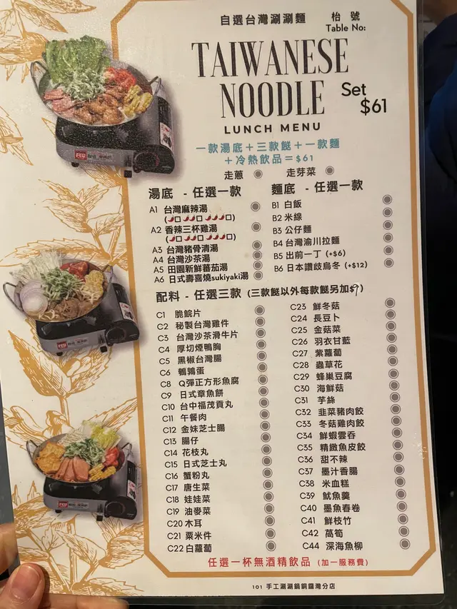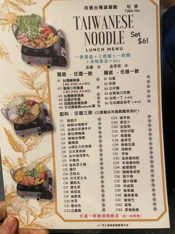 今日趁住晏晝放假去左呢度午市61蚊打邊爐午市套餐。餐廳係金朝陽中心2期,大廈入口係登龍街,餐廳係29樓,靠窗景觀開揚。去到大約12點5,等嘅人唔係太多,15分鐘就入到去坐,午市用餐限時60分鐘。佢個lunch set $61加一,包一款湯底+飯/米線/拉麵/公仔麵+自選3餸,同一杯沒酒精飲品,凍熱同價。每個爐入面都有蕃茄,生菜,粟米同芽菜作為配菜。呢個價錢係香港坐底食個普通lunch都難搵,唔好話銅鑼灣核心商業區。1.台灣沙茶湯底+拉面+牛肉/雞件/雲吞+炭燒咖啡珍珠($61)。沙茶湯底滾起左聞落幾香,食落沙茶味都啱啱好,而且本身自帶少少辣,幾惹味。建議一開始先大火滾起個湯底,然後再較番個細火暖住個爐慢慢食。牛肉係鮮滑牛,比較細碎,食落沒根亦沒肥膏。雞件有3大件,一舊雞脾肉,兩舊腳根位,食落有少量冰鮮味(沙茶湯底都覆蓋唔到)。雲吞兩粒,普普通通。基本上所有食材都只係會有沙茶湯底味。拉面份量相當充中,長時間浸係個湯底到都沒脹起。面滑身,唔係好掛湯。炭燒咖啡珍珠都幾大杯,上面加左cream同埋Oreo碎碎,打住鞭爐飲凍野都爽嘅,雖然沒甜度揀,但都唔會太甜。2.日式壽喜燒湯底+魚腐/牛肉/餃子+特濃朱古力特飲($61)壽喜燒湯底隨著湯愈少就愈甜,食到最尾連d食材都吸哂個湯底而變得甜左。呢餐性價比高,飽就不在話下,價錢比起街舖仲平,坐得舒服,仲有個gas爐俾你過下打邊爐隱。…查看更多