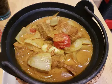 上次試了龍蝦和焗魚腸,味道不錯,今次試一試它的馬來咖哩新鮮雞及峇峇炒飯咖哩的確不是港式咖哩,不過它的馬來風味略為遜色,像是購買現成的咖哩醬,沒有怎樣特別泡製或加入什麼特別香料泡製的,普普通通的馬來風味咖哩醬,雞更大失所望,標榜新鮮雞,但沒大雞味,口感亦跟一般冰鮮雞相約,覺得這味菜式可以不試峇峇炒飯被廚房弄錯了為滑蛋炒豬頸肉飯,由於沒有時間,不改了(同時亦有其他客的食物錯了)。豬頸肉一般,少肥,不太香,滑蛋炒得不錯,滑,有蛋香,半生熟,挽回點點分數