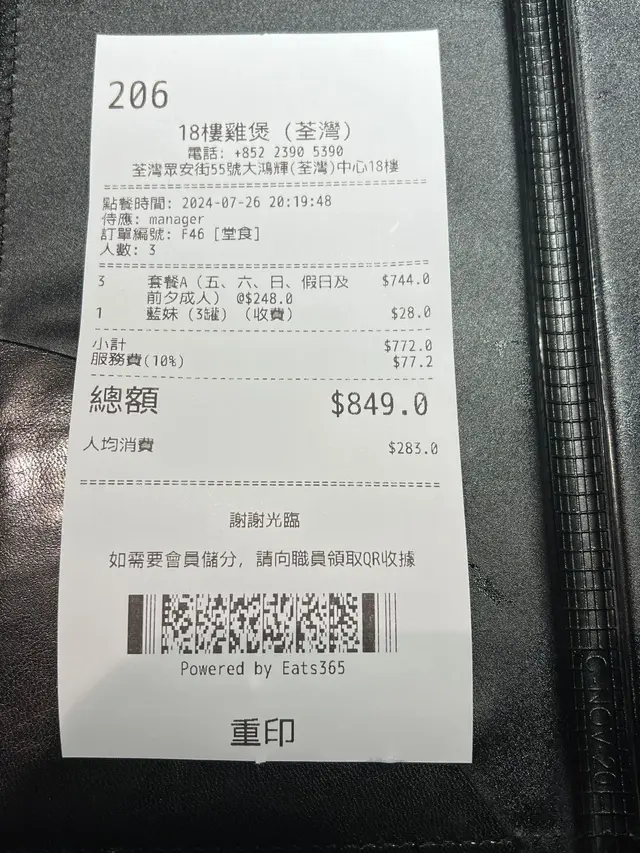 第一次食18樓雞煲,食雞煲就係想食雞,打邊爐就係想食牛,點知雞無雞味牛無牛味,豉油無豉油味,無樣入得口。素描點餐系統失靈,手寫點餐食物黎唔齊,叫左鱔片無黎過,生蠔扇貝結晒冰,連冰一齊放落個煲,唔肯定冰水衛生程度。全晚大部分時間食丸食餃。服務質素差到無得再差。全場坐得10%, 一行5人都要我地坐六人卡位,都唔安排坐大啲位置,出入取食物飲品十分唔方便,每人$360。明白點解香港人舟車勞頓比車費都要北上食飯。…查看更多