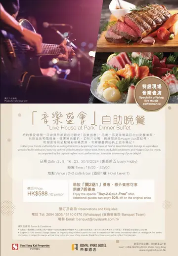 收到有個音樂盛會自助晚餐傳單,有買二送一,再加人就會有7折。 傳單上寫:品嚐一系列瑯滿目的自助餐美饌,包括滋味和風刺身、燒澳洲肉眼扒、幻彩片皮鴨、精緻甜品及Haagen-Dazs雪糕等。朋友生日諗住食個自助餐,就揀呢間。Whatsapp 訂位要先付全數先留位,都無所謂。食飯當晚去到,見到都幾多檯,仲有 live band setting,通道很窄。 我地張檯就係隔離房,其實環境仲寬敞,我哋係滿意的。齊人坐低就話上左個刺生盤先。之後就有一個煙霧瀰漫既刺生盤出現。 4人份,種類都算多,琳琳種種有7,8樣,還算新鮮。 但只得一盤,出去亦無得再拎。之後出去攞野食,但發現所謂自助餐的食物真的嚇了一跳。 冷盤:(罐頭)生果蝦沙律,酸蓮藕,手撕雞肉,菜,海蜇,兩碟 cold cut 凍腸。 連沙律醬也沒有。熱盤: 兩款湯及麵包,燒牛肉,預先包好既片皮鴨,西蘭花炒蝦球,苦瓜鴨殼,紅酒和牛面頰,滷水雞翼,咕嚕肉,蕃茄魚柳,櫻花蝦炒飯。甜品: 3款蛋糕,切到麻雀大小;豆腐花;Haagen-Dazs雪糕; 西瓜及哈密瓜片。仲有自助飲品,係罐裝汽水。咖啡熱茶都是自己去整。以上就是所有食物,收正價$588真的不值。 雖然所謂自助餐不如想像,但員工服務很殷勤,食物也refill 得很快,live band 表演也不錯。 但真心不明白為何要攪一個這種食物質素既所謂自助餐呢?…查看更多