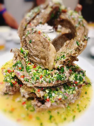 第一次吃這家私房菜,聽說這間餐廳要一個月前預訂的,進店內前亦需要報號碼;店內分為不同的包廂房間,這樣應該就是私房菜應有的私隱度吧。雞湯鮑片有專人即場把切到薄片的鮑片及鮑魚群邊,放進一大鍋雞湯裏泡熟,感覺鮑魚是挺新鮮的,雞湯就濃而不油,看來師傅手勢不錯。帶子沙律就是正常的沙律,加上一粒煎過的帶子,只是在中餐廳裏看到的感覺比較新奇。口水西瓜龍蝦這道菜一上碟,我就只看到一串串的西瓜和龍蝦殼,首嚐口水汁西瓜,想不到竟然意外的好吃,味道甜甜辣辣又多汁,冰涼的西瓜也中和了口水汁的辣到。蟹肉蒸肉餅蟹肉方面我是沒有吃的,但肉餅的味道濃郁,拌飯的味道也不錯,只是略嫌肉餅的肉質比較軟爛,沒什麼口感。蒸龍躉面頰看著就是滿滿的骨膠原南瓜萵筍絲我挺喜歡這道菜,大概夏天就是想吃一些清新的菜式吧,而且萵筍絲很嫩。乳鴿乳鴿是切開一半上碟的,雖然皮不太脆口,但吃的油潤感是挺好味的。海鮮麵這是玩味比較重的一道菜,因為要用揼子敲碎麵條來吃的,不過他調的醬料比較清淡,不太合我口味,所以我就沒有吃很多了。到了甜品的環節,就是拔絲草莓,這個甜品的畫面很美,味道就像在吃冰糖葫蘆的感覺。整體而言,這是充滿視覺上衝擊的一天,而且這是比較適合一大班人一起吃的。…查看更多