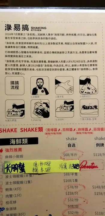 尖沙嘴間shake shake海鮮開嘅時候已經想去試試,但因為價錢唔平又唔就腳所以遲遲都未去。點知!比我發現太子都有間shake shake海鮮,價錢仲相當親民,咁梗係即刻去試下啦。餐廳有提供手套同圍裙,相當貼心。一坐低就嗌咗杯荔枝特飲,$38細細杯,賣相唔錯,但係係濃縮果汁沖出嚟的,唔算難飲,味道偏甜。(5/10分)之後就揀海鮮同醬汁,我就揀咗青檸醬。廚房烚熟海鮮之後放係膠袋入面,店員拎出嚟shake就食得啦!海鮮新鮮好食,我仲嗌咗金針菇同埋娃娃菜,青檸醬味道酸酸辣辣,不論同蔬菜定海鮮都非常之夾,蜆蚌同鮑魚都十分鮮甜彈牙,正!(8.5/10分)除咗shake shake海鮮,我仲嗌咗麻辣小龍蝦,食落麻辣味唔夠,冇咩龍蝦鮮味,呢個就唔太啱我口味,個人覺得麻麻,可以唔使嗌。(5/10分)冇嗌飯麵,淨食海鮮食飽有點空虛,但都還算ok,多人去嘅話建議嗌個主食,咁多海鮮埋單300幾,抵食!…查看更多