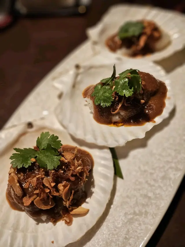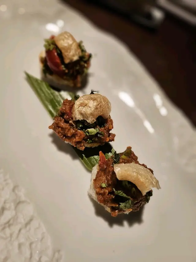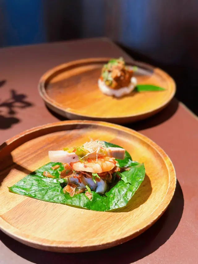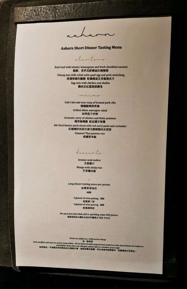 Aaharn, could not be more straightforward to be the name of a restaurant, means "food" in Thai. Situated in the historic Tai Kwun, it is a renowned restaurant that offers an authentic culinary exploration of Thai cuisine. Helmed by acclaimed chef David Thompson and awarded one Michelin star, Aaharn specializes in dishes made from the best quality and freshest ingredients sourced from Thailand. Featuring traditional techniques like hand-pressed coconut milk, it transports diners to Thailand through innovative yet wholly authentic cuisine. - 𝙰𝚖𝚞𝚜𝚎 𝙱𝚘𝚞𝚌𝚑𝚎 -𝙈𝙖 𝙃𝙖𝙬 (7/10)Meaning "galloping horses" in Thai, the amuse bouche was a delightful preview of the meal to come. Pairs of bite-size pineapple piece topped with a minced meat relish, they provided a cooling base against the lively mix of meats and herbs that awakened the senses. - 𝚂𝚝𝚊𝚛𝚝𝚎𝚛 -- 𝘽𝙚𝙩𝙚𝙡 𝙡𝙚𝙖𝙛 𝙬/ 𝙡𝙤𝙗𝙨𝙩𝙚𝙧, 𝙡𝙚𝙢𝙤𝙣𝙜𝙧𝙖𝙨𝙨 & 𝙛𝙧𝙚𝙨𝙝 𝙨𝙝𝙧𝙚𝙙𝙙𝙚𝙙 𝙘𝙤𝙘𝙤𝙣𝙪𝙩 (7.5/10)- 𝙉𝙤𝙧𝙩𝙝𝙚𝙧𝙣 𝙏𝙝𝙖𝙞 𝙩𝙤𝙢𝙖𝙩𝙤 𝙧𝙚𝙡𝙞𝙨𝙝 𝙬/ 𝙘𝙧𝙪𝙣𝙘𝙝𝙮 𝙧𝙞𝙘𝙚 (8/10)- 𝙁𝙧𝙚𝙨𝙝 𝙧𝙞𝙘𝙚 𝙫𝙚𝙧𝙢𝙞𝙘𝙚𝙡𝙡𝙞 𝙨𝙖𝙡𝙖𝙙 𝙬/ 𝙨𝙘𝙖𝙡𝙡𝙤𝙥 (8/10)The tomato relish has stolen the show - piquant tomatoes, rice crackers and fiery chillis came together in a spicy dish but still offered a balance of savory and tart. Offering respite, the vermicelli salad balanced the heat with plump scallop and silky noodles. Each starter provided generous portions and twist on classics, leaving guests eagerly anticipating the meals still to come. - 𝙼𝚊𝚒𝚗𝚜 -- 𝙂𝙧𝙞𝙡𝙡𝙚𝙙 𝙘𝙤𝙧𝙣 & 𝙧𝙞𝙫𝙚𝙧 𝙥𝙧𝙖𝙬𝙣 𝙨𝙖𝙡𝙖𝙙 (7.5/10)- 𝘾𝙝𝙞𝙘𝙠𝙚𝙣 𝙨𝙤𝙪𝙥 𝙬/ 𝙮𝙚𝙡𝙡𝙤𝙬 𝙗𝙚𝙖𝙣𝙨, 𝙗𝙖𝙨𝙞𝙡 & 𝙡𝙞𝙢𝙚 (8.5/10)- 𝙎𝙩𝙞𝙧 𝙛𝙧𝙞𝙚𝙙 𝙏𝙝𝙖𝙞 𝙜𝙧𝙚𝙚𝙣𝙨 (7.5/10)- 𝙍𝙚𝙙 𝙘𝙪𝙧𝙧𝙮 𝙤𝙛 𝙄𝙗𝙚𝙧𝙞𝙘𝙤 𝙥𝙤𝙧𝙠 𝙘𝙝𝙚𝙚𝙠 𝙬/ 𝙥𝙚𝙖 𝙚𝙜𝙜𝙥𝙡𝙖𝙣𝙩𝙨 (8/10)- 𝙏𝙝𝙖𝙞 𝙟𝙖𝙨𝙢𝙞𝙣𝙚 𝙧𝙞𝙘𝙚The mains delivered vibrant Thai flavors in abundance. I especially liked the chicken soup with citrusy yet appetizing undertone that left me yearning for another bowl. Generous amount of tender pork cheek soaked in creamy red curry comprised a highlight dish. While the curry lived up to Thai cuisine's reputation for heat, the rich and nuanced flavors far outweighed any spice. Substantial but light, I left fully satisfied yet not uncomfortably full. - 𝙳𝚎𝚜𝚜𝚎𝚛𝚝𝚜 -- 𝙈𝙖𝙣𝙜𝙤 𝙬/ 𝙨𝙩𝙞𝙘𝙠𝙮 𝙧𝙞𝙘𝙚 (7.5/10)- 𝙎𝙩𝙚𝙖𝙢𝙚𝙙 𝙧𝙞𝙘𝙚 𝙙𝙪𝙢𝙥𝙡𝙞𝙣𝙜 𝙬/ 𝙘𝙤𝙘𝙤𝙣𝙪𝙩 & 𝙥𝙖𝙡𝙢 𝙨𝙪𝙜𝙖𝙧 (8/10)A satisfying conclusion to the meal. The rice dumpling was a real star - exterior of shredded coconut added textural contrast to the soft rice, enclosing rich coconutty palm sugar. Both showcased local flavors and that Aaharn has mastered Thai desserts as much as their savory dishes. …查看更多