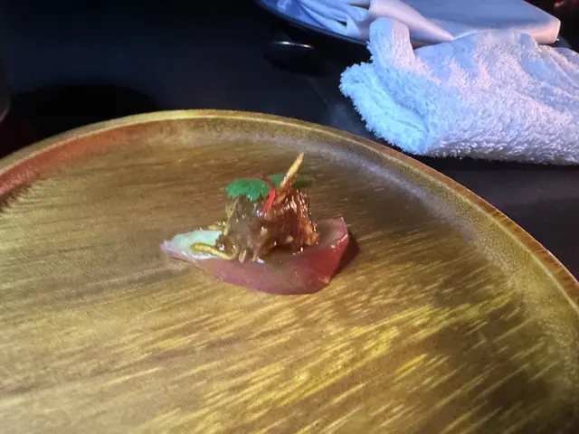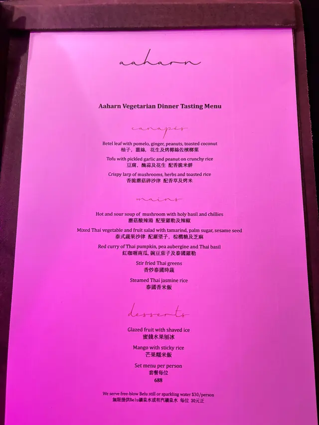 於2024年3月14日,白色情人節,和愛的人吃晚餐。Aaharn 是由國際知名廚師 David Thompson 對泰國美食的世界級探索,綜合研究與技術技能結合而創造出香港獨一無二的菜單。在大館這地方享受用餐體驗增加了很多額外分數。餐廳裝潢簡約,以蘭花和鳥尾花帶出整個格調,燈光暗暗的,餐廳地方不大,適合調情。這是我第一次嚐泰國菜fine dining,點了688一位的tasting menu。小食-Ma Hor🍍傳統泰國小食,以豬肉、蝦、花生等煎成,再放於菠蘿上。它集合了甜、鹹、香辣,替我們喚醒舌頭該起床好好享受接下來的大餐。前菜Betel Leaf with Lobster🦞 [很喜歡]近期常見fine dining上用到了檳榔葉,自身帶有甘甜香氣。椰子、姜等配料配合好Refreshing ,令到龍蝦肉味道被提升。前菜-Ching Mai Chilli relish🌶️ [很喜歡]貌似零殺傷力的前菜,炸豬皮脆而不膩,點了少少洋蔥、青皮辣椒主導的醬料已經噴火,舌頭在叫嚷着火辣時,同時叫着爽。Egg Net with chicken and sha🪺以蛋花做成的網狀卷成,包裹着雞肉,帶點香茅的清香,鹹香的肉味道,咬起來口感像肉松。湯品-Guk’s Hot & Sour soup of braised pork ribs🐷一碗辣勁和酸度剛好的湯,酸味先出,後而辣,清新得宜,很喜歡湯裏的乾蒜及乾洋蔥,湯品內的豬肉大片,以湯拌飯一流。主菜-Grilled silken aubergine salad🍆冷盤的沙律,上面有個流心蛋,被薄荷帶着的茄子,顯出另一風味,清新爽脆。主菜-Aromatic curry of Chicken and Ratte potato🐥泰式瑪莎曼黃咖哩,甜甜的,醬汁濃稠,香氣撲鼻。雞肉嫩滑,薯仔煮得入味,拌飯之選。主菜-Stir fried Iberico pork cheek and coriander 🐖 [很喜歡]採用了豬頸肉,故此肉身較鬆軟,像蜜糖味的豬肉,甜得來,烤焦味又出,單吃都非常喜歡。甜品-Mango Stick Rice🥭吃泰國菜怎能少得芒果糯米飯,這個是我看過最fancy的賣相,帶點咸咸的味道挺有趣,但略覺椰醬比較少,且和芝麻窩夫不太搭,我還是比較喜歡傳統的口味。一餐挺滿意的泰國菜,味道層面上五星,上菜速度慢一點更好。-$30 free flow水的-這裏的椰子水比越南更新鮮,更甜地址:中環中環荷李活道10號大館02座槍房1樓…查看更多