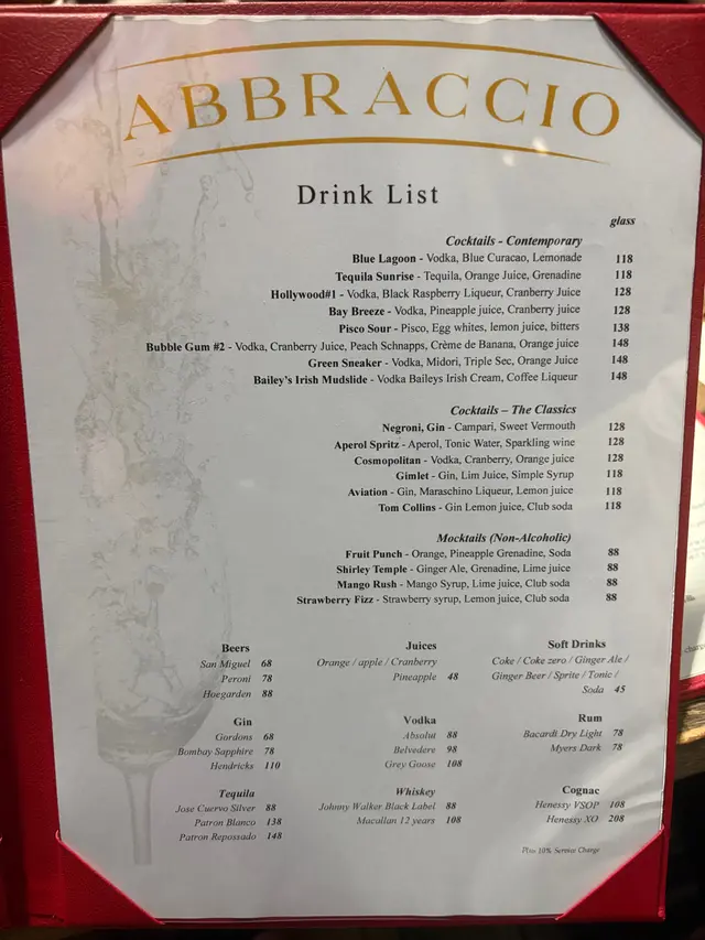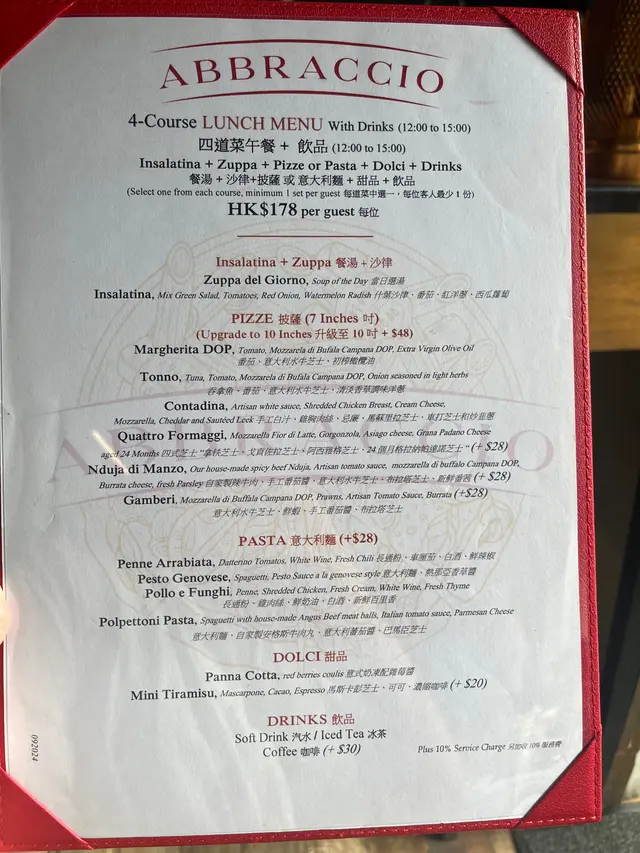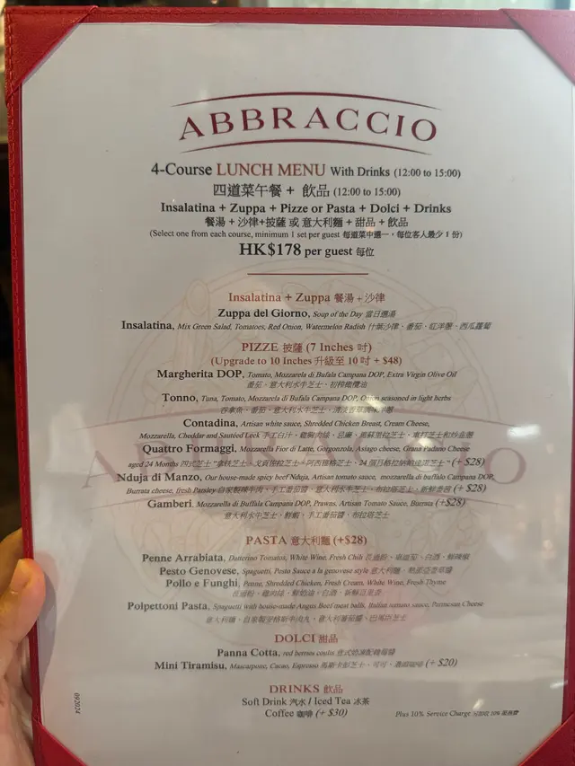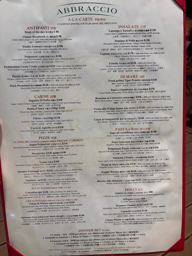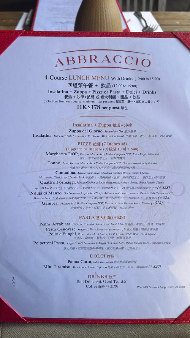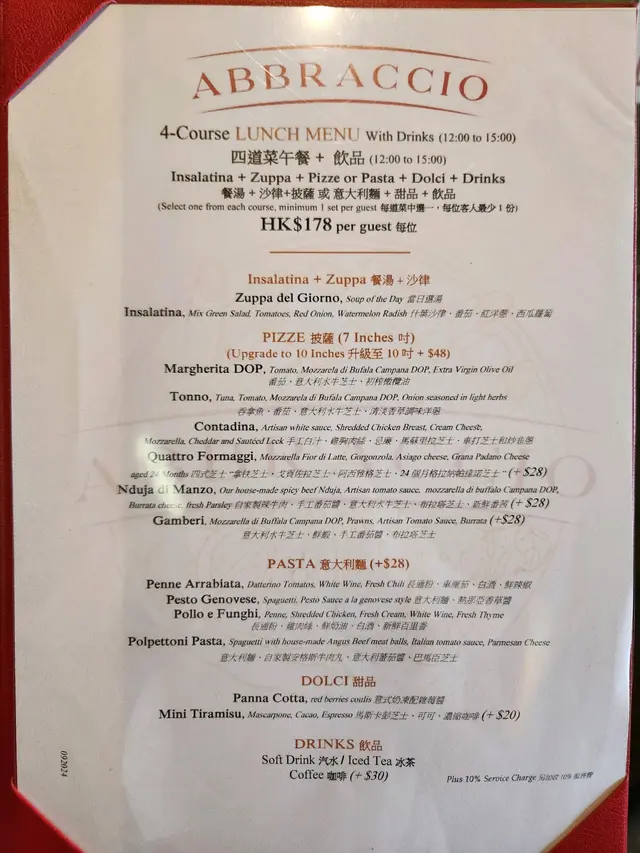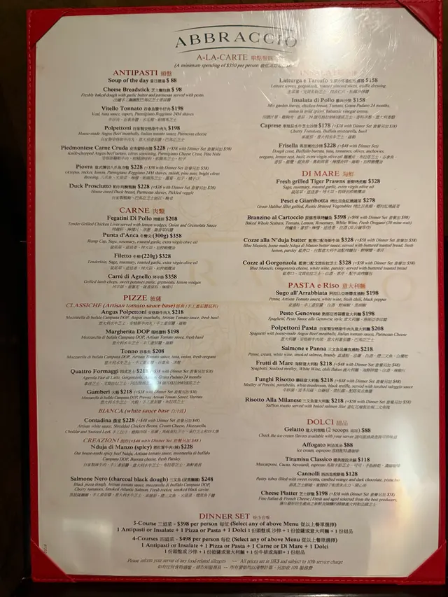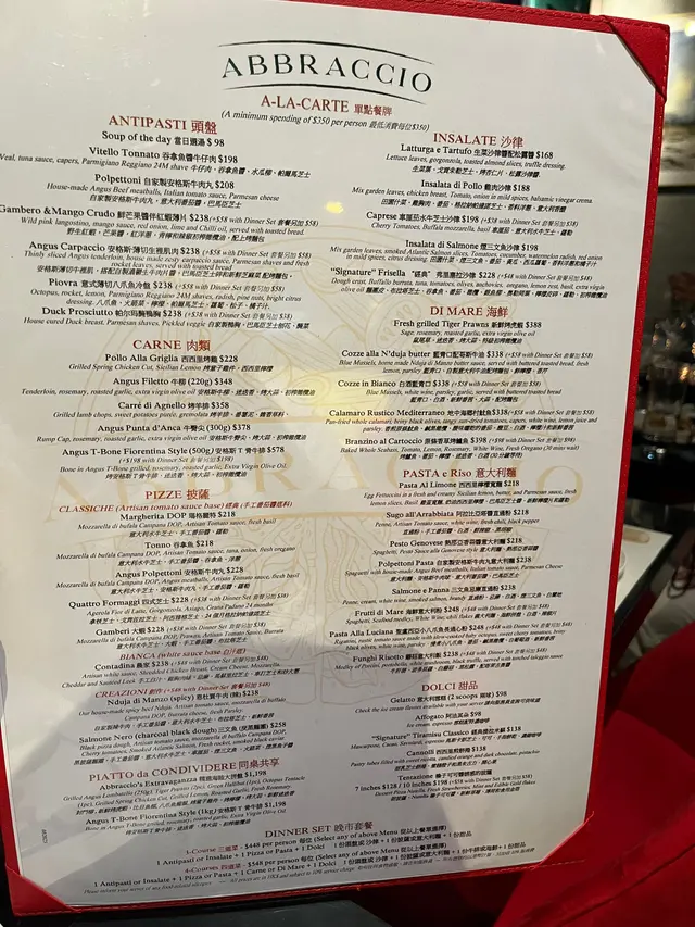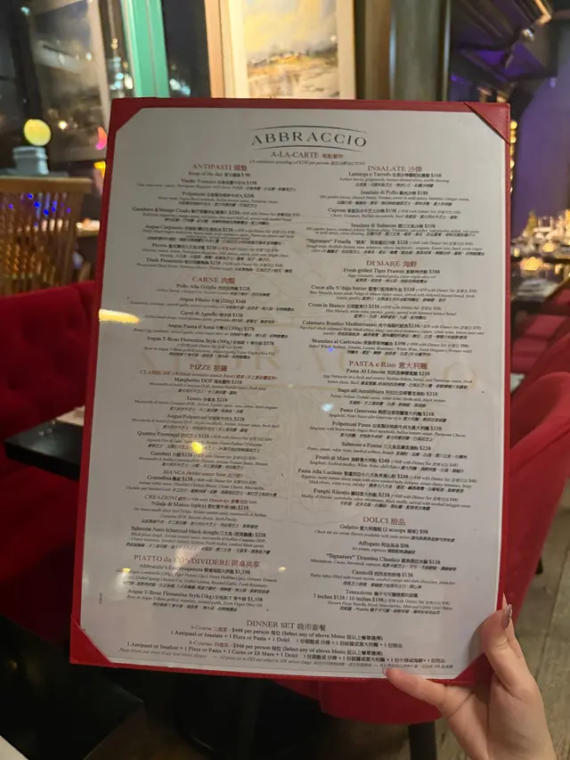 Abbraccio (中環) 網上訂座即賺Rice Dollars 網址: https://s.openrice.com/QrbS0KS4C00 地址: 香港中環雲咸街75-77號嘉兆商業大廈5樓 電話: +852 26333878