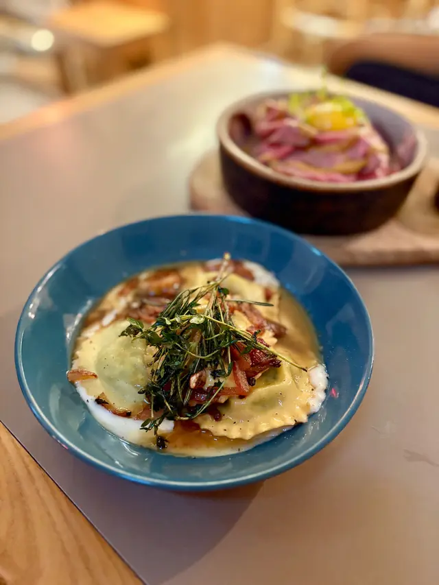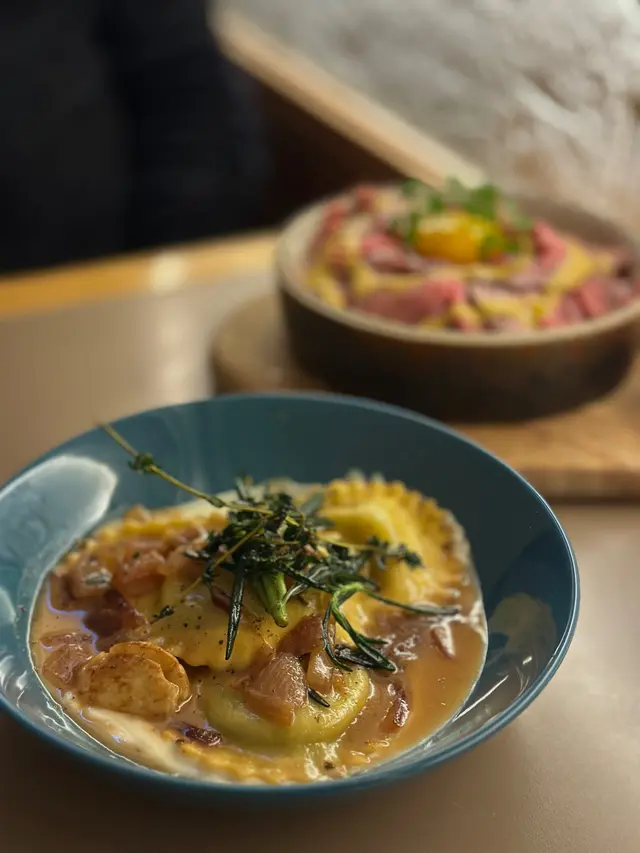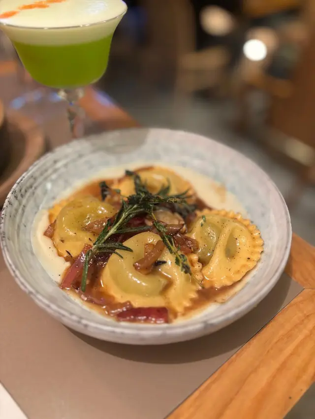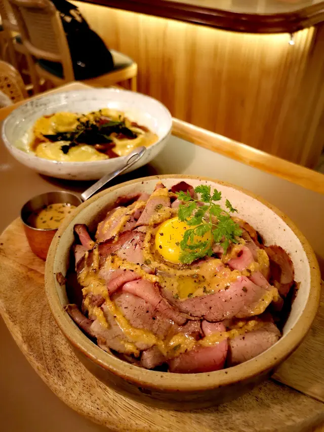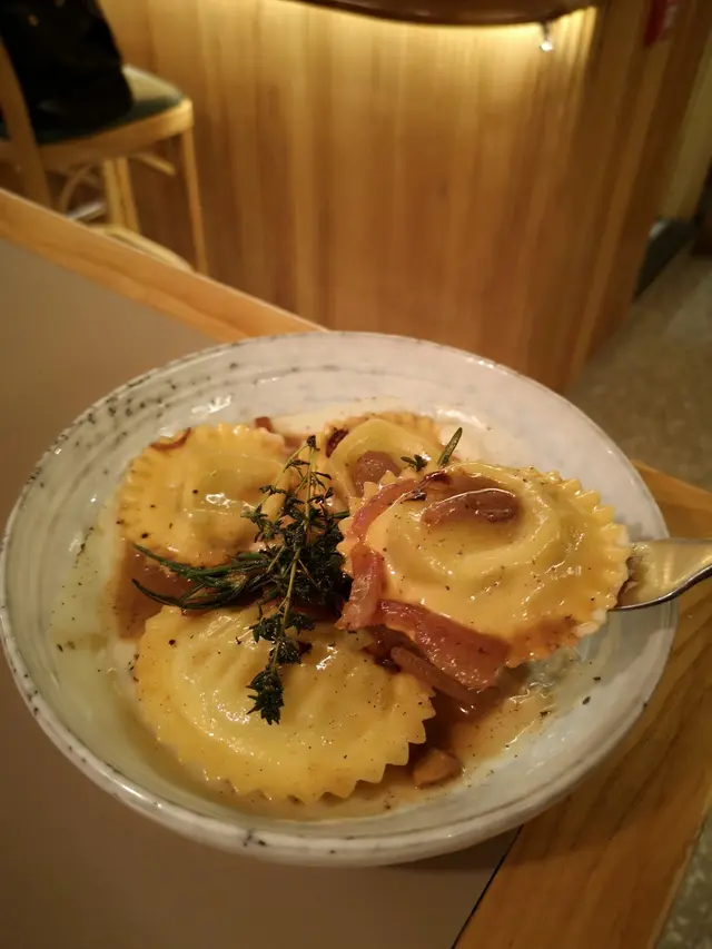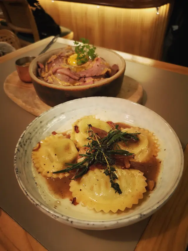 在中環蘇豪區這間意日fusion餐廳 找到了我最喜愛的意大利芝士餛飩😍!!味道真心有驚喜❤️做到皮薄餡靚 既帶有creamy的口感 但又不會太膩 恰到好處✅朋友們一致認同👍高質之選🥰👉香草芝士意大利餛飩🧀Herb Ravioli with 30-month-aged Parmesan fondue 🫕 餛飩皮軟腍 不會太厚 內餡放了新鮮香草和肉碎🌿配合30個月巴馬臣芝士醬 味道很夾很濃郁 超級好味🤤到目前為止 真係我試過最好食嘅意大利餛飩🤭💯!👉松露闊條麵Truffle Tagliolini👍即刨的黑松露放在意粉上 味道很香😋 份量都十分慷慨!👉醃豬頰肉番茄長通粉Rigatoni Amatricana長通粉掛汁能力很好 但番茄汁味道中規中矩 沒什麼特別的👉薄片意式生帶子Scallop Carpaccio帶子新鮮 廚師刀工不錯 切得很薄👏👉招牌提拉米蘇Tiramisu❤️ 果然係招牌甜品 好彩當日試到最後一個🤭 芝士幾香滑 配合淡淡的咖啡味 酒味比較輕 口感很綿密 入口即溶 味道不會太甜或太苦💕本身想試埋佢個招牌Roast Beef Japanese Rice可惜當日咁岩賣晒🥲唯有留返個機會比我下次再來試啦haha😆…查看更多