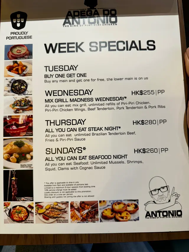 ADEGA DO ANTÓNIO THE KING OF PIRI PIRI (中環) 網址: https://s.openrice.com/QrbS0VJWD00 地址: 香港中環蘇豪士丹頓街33號金禧大廈地舖 電話: +852 63367858