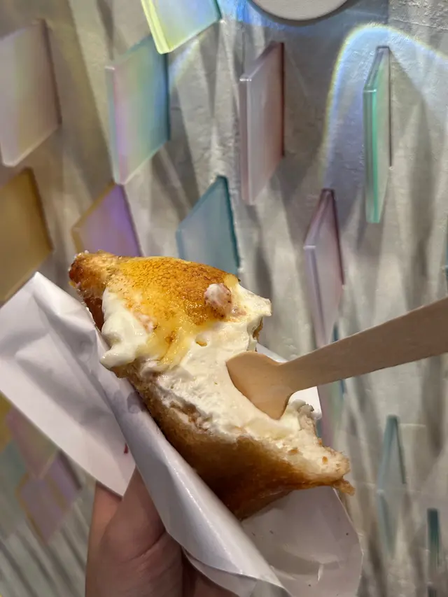 人氣2nd street到港,跟隊去潮聖🤪去排之前見到呢間忌廉三文治😍又比佢吸引咗鋪面好光猛,座位好少,啲人通常都係外賣拎走。🌟焦糖燉蛋口味 $38一拎上手已經好香,呢個口味真係神還原咗法式焦糖燉蛋(Crème Brûlée)!忌廉餡香濃幼滑,蛋香味好出,最正係面頭真係用火槍燒過一層脆脆嘅焦糖,配埋金黃酥脆的方包外皮,成件件好香口,食落「咔哧」一聲😚冰涼的忌廉餡「咇」出嚟,變成有少少冰火交融。 🌟開心果口味 $38細細粒嘅開心果碎增加口感,最驚喜係面頭淋咗士多啤梨醬,酸酸甜甜咁撞埋開心果嘅香,味道層次即刻豐富晒👍🏻但私心鍾意焦糖燉蛋多啲其實食完一份已經好飽,事關佢真係好足料,而且忌廉都係幾膩但又忍唔住食咁食啲邪惡食物😂建議帶多啲紙巾,因為食得有啲狼狽🤣同埋最好食完飲番支茶解膩👍🏻查看更多