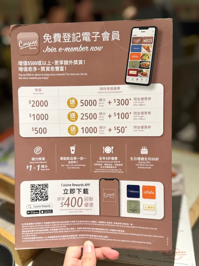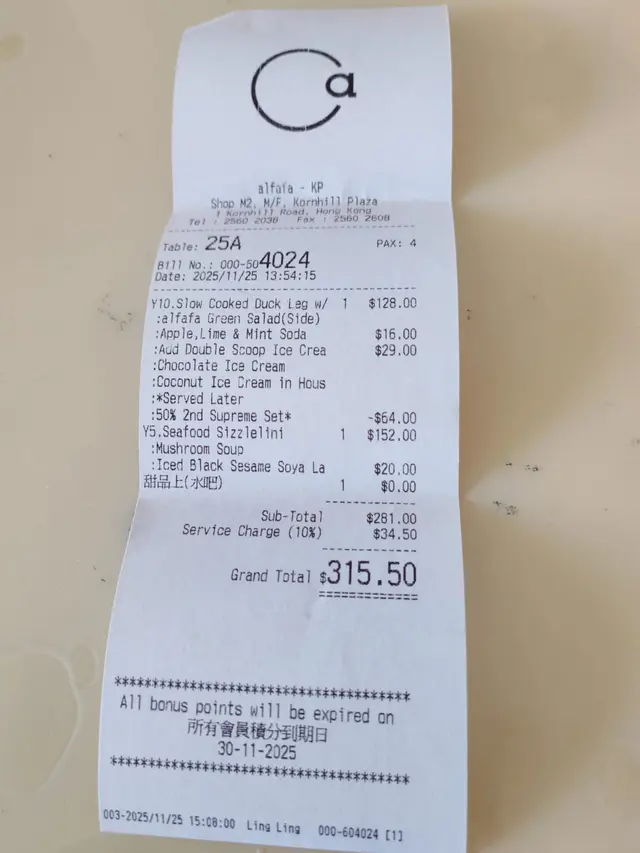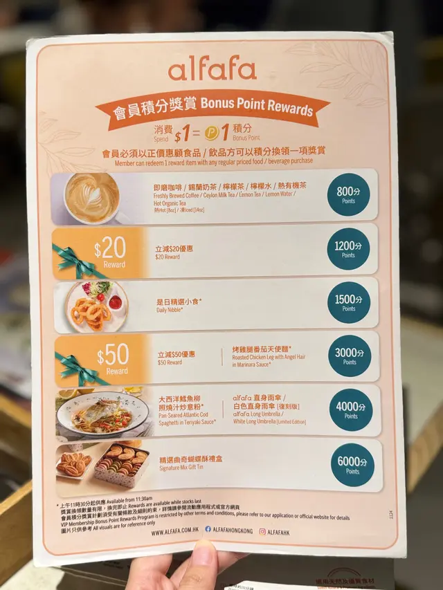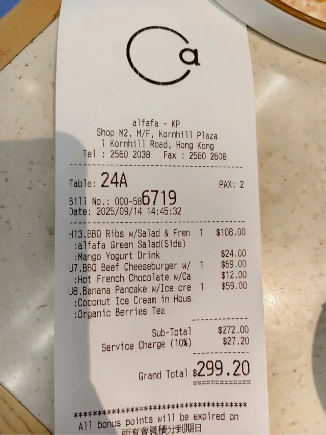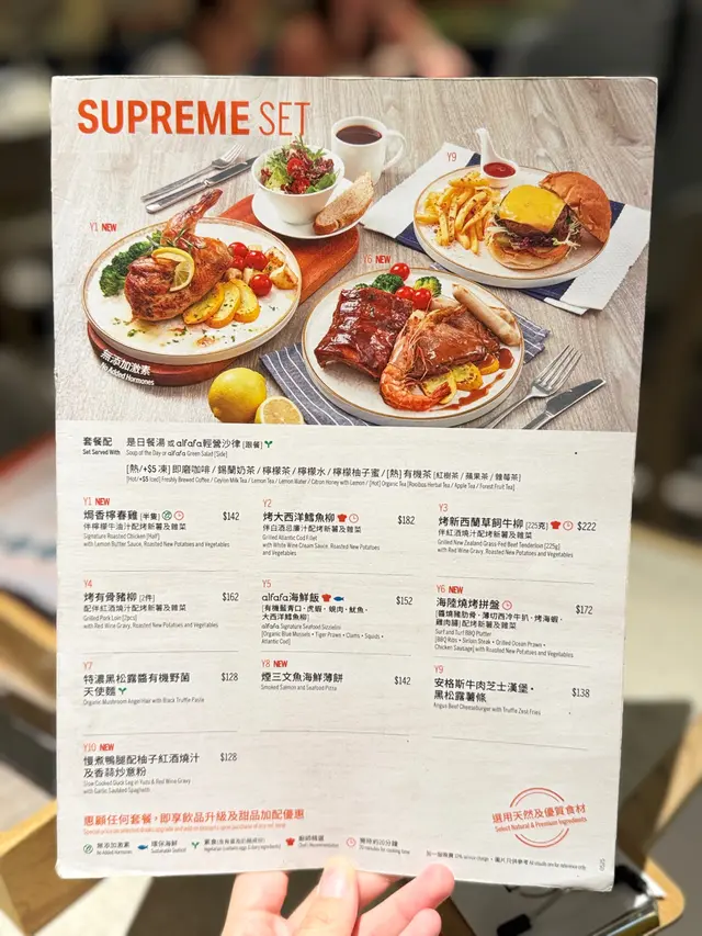 呢日難得同老公都放星期日,大家就去康怡行吓街食吓嘢。去到康怡嗰時大約1:45,所以就睇lunch menu點知隔咗陣2:00店員就遞上Tea Set Menu,所以我哋兩邊都有嗌~▫️Lunch:《燒豬肋骨 配alfafa輕盈沙律及薯條 $108》附熱飲/加$5凍飲升級+$24 芒果Yogurt drink 份量比預期大,有成六至七條肋骨,燒得入味,肉夠腍唔會乾,加上燒汁幾惹味; 粗薯條外脆香糯,令人一條接一條;沙律菜新鮮帶微酸可減膩。這杯芒果Yogurt drink好美味,乳酪口感濃稠,偏甜唔會酸,仲有啖啖香甜芒果肉~▫️Tea:《燒烤醬炒牛肉芝士漢堡·薯條 $69》漢堡包焗過帶微脆,牛肉份量多加上半蓉芝士同蕃茄,可口又Juicy~ 同樣配有香脆開胃的粗薯條~附熱飲/加$5凍飲升級+$12 法式焦糖爆谷朱古力(熱)呢杯朱古力賣相吸引又好味,$12好抵~▫️Tea:《即製香蕉pancake·雪糕 $59》附熱飲/加$5凍飲熱雜莓花茶 pancake熱辣辣香噴噴,入口鬆軟,加埋雪糕一冷一熱好正~ 埋單時仲免費登記埋佢個「 Cuisine Rewards 全新會員計劃 」,有成總值超過$400迎新優惠,包括$25優惠券及免費alfafa 招牌沙律優惠券~又可以留返下次用啦!…查看更多