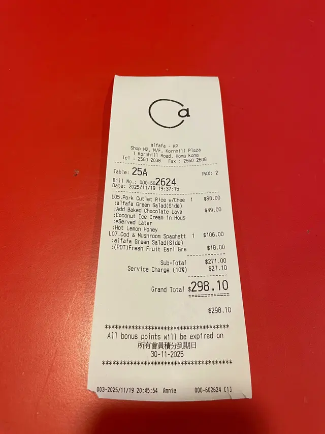alfafa (康怡廣場北座) (太古) 網上訂座即賺Rice Dollars 網址: https://s.openrice.com/QrbS0430100 地址: 香港太古康山道1-2號康怡廣場北座M樓M2號舖 電話: +852 25602038