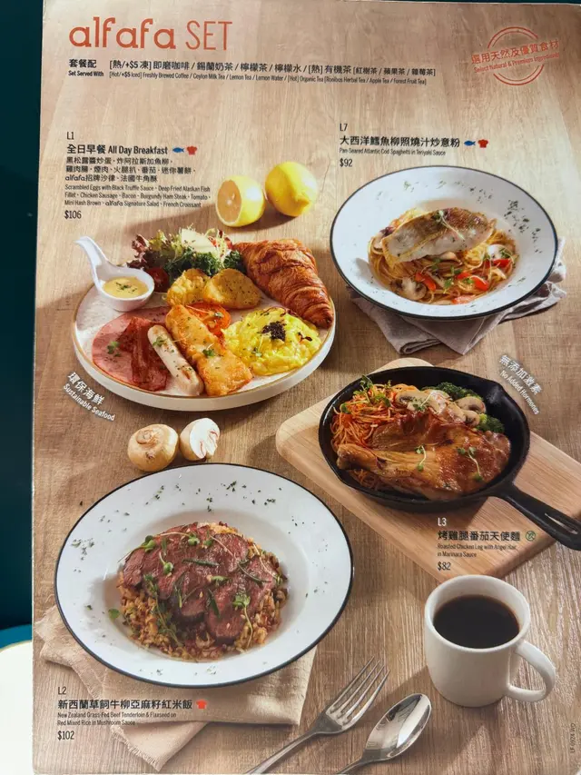 點咗 2 個 alfafa SET,青醬意粉 同 牛肉漢堡,套餐附送熱飲,另外亦可以用優惠價加配小食及甜品。