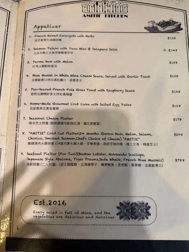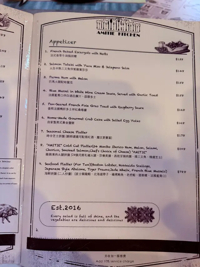 Amitie Kitchen (尖沙咀) 網上訂座享低至9折優惠兼賺Rice Dollars 網址: https://s.openrice.com/QrbS0JBS900 地址: 香港尖沙咀厚福街8號H8 9樓 電話: +852 31049234