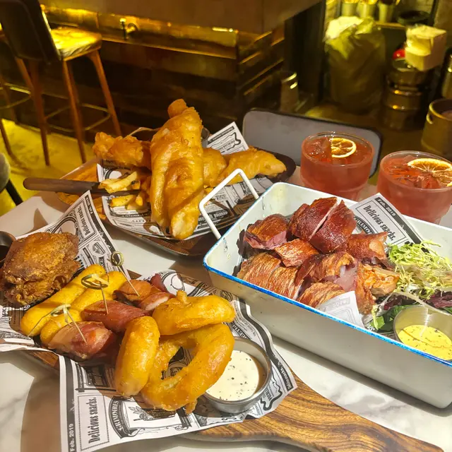 小食拼盤 送到了, 這個拼盤: 洋蔥圈, 芝士條, 煙肉腸, 及雞翼,