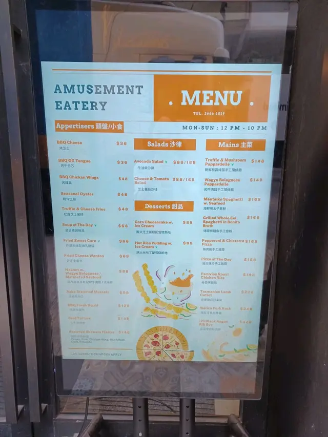 說到Amusement Eatery,一定會讓人聯想到一個充滿遊戲的地方。但你知道嗎?這個地方其實還有一個吸引人的地方——美食!這家餐廳位於長沙灣福榮街,裝潢和氛圍都非常有趣,讓人有種置身於娛樂場所的感覺。當然,我來這裡的目的是品嚐美食。當我看到菜單上的Pizza of the Day(是日推介手工披薩)時,我立即被吸引了。這款披薩的口味是大阪燒,看起來非常美味,而且只要$128就能夠食到這麼豐富的披薩,真是物超所值!當披薩上桌時,我馬上聞到了它的香味,這令我更加期待。當我嚐了一口後,我被它的美味所征服了。披薩的餅皮非常鬆軟,配上大阪燒的味道,簡直是完美的組合。這款披薩讓我想起了我在大阪的美好回憶,真是一份珍貴的食物體驗。除了披薩,我還點了紐西蘭草飼西泠。這道菜的質素非常高,牛排的質感非常好,而且味道非常美味。搭配香炸幼身薯條,真的是一絕。午餐加配炸芝士雲吞也是一道非常好吃的菜品,它的味道非常濃郁,我真的很喜歡。吃這些美食的時候,我感覺自己就像置身於一場美食盛宴中,真是太開心了!炸芝士雲吞味道非常濃郁,而且炸得非常酥脆。每個雲吞都包裹著濃郁的芝士,吃起來非常香口。最後,我點了一杯熱朱古力給囡囡,它的味道非常濃郁,真是一個完美的結尾。Amusement Eatery (長沙灣)長沙灣福榮街538號喜遇地下2號舖#AmusementEatery #手工披薩 #香炸幼身薯條 #炸芝士雲吞 #紐西蘭草飼西#深水埗#foodiehk#foodlover#pizza…查看更多