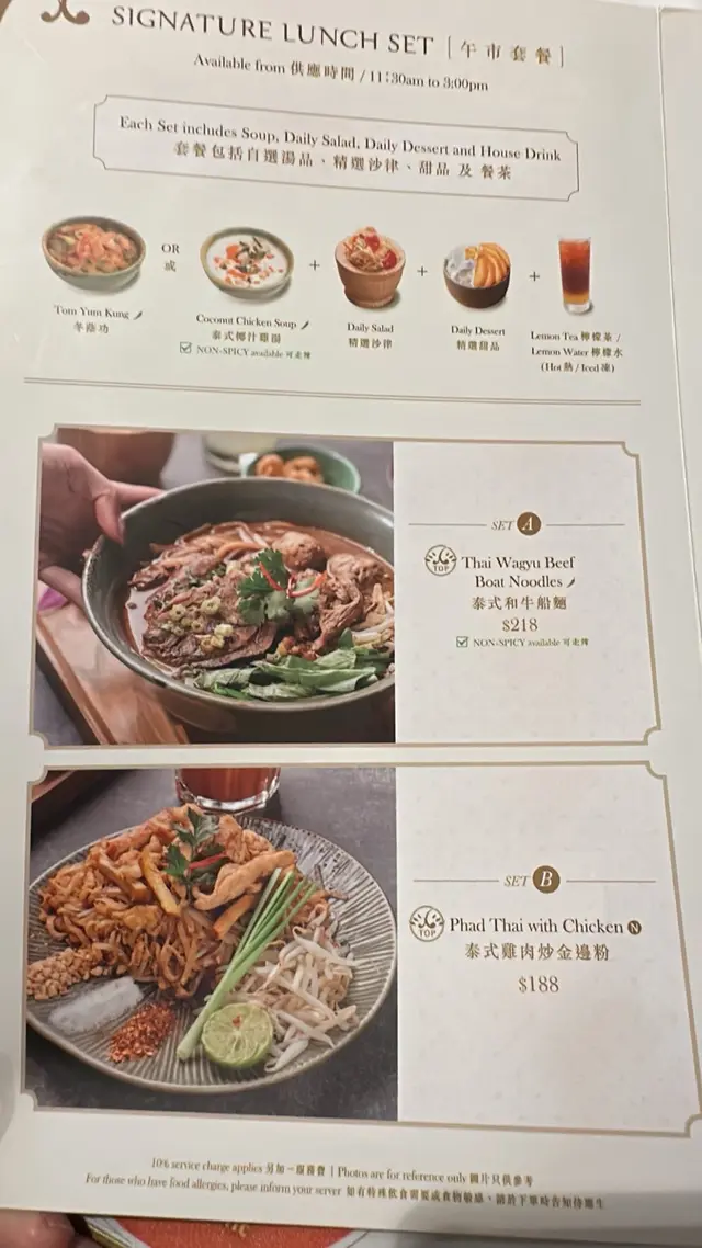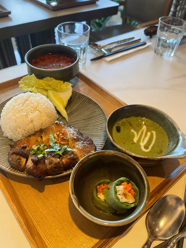 Apinara平時返工都去食,見到佢出晚市新出$10雞再送啤酒,即刻上Openrice book檯!隻香茅燒雞唔行貨,肉嫩又入味,如果個皮可以脆D就更好。當晚再叫咗幾樣嘢,最後埋單4個人$1000多D,食得好飽下! 生🦐刺身配青木瓜沙律🥗:賣相特別,係撈沙律來,生蝦口感爽口,味道清爽微辣,青木瓜切片上,感覺比切絲仲好口感。雜菜椰子🥥雞湯:選了不辣的,味道都keep到濃厚,飲完個人暖哂😊🐮封門柳炸河粉:第一次食呢個配搭,好新奇!賣相吸引,牛肉熟成道啱啱好,河粉炸過幾脆口;底下有啲汁,成件事幾夾。牛肉船麵🍜:湯頭好濃郁,所以個金邊粉都掛到汁,配料睇相就知,d肉肥瘦適中,食落估唔到咁嫰,同埋好鐘意有埋脆嘅炸豬皮😊。黃咖喱軟殼蟹🦀:初初見到仲諗點解d汁好似好乾身,唔似平時出面咁滑嘟嘟嘅,但食落又覺得ok喎,個咖喱味相對較少,甜味較突出,配埋個蟹係好夾嘅、所以忍唔係叫左Roti又叫埋個白飯食🤭P.S. 個餐仲包左🍺,個芒果糯米飯仲係半價,覺得都幾抵食呀!…查看更多