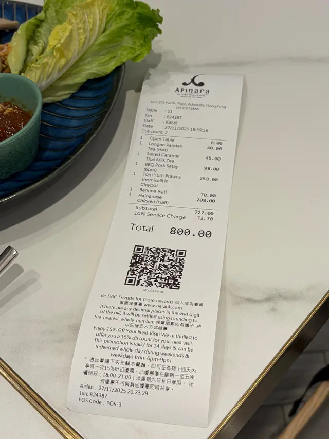 Apinara (金鐘) 網上訂座享低至8折優惠兼賺Rice Dollars 網址: https://s.openrice.com/QrbS0diG700 地址: 香港金鐘金鐘道88號太古廣場L2樓205號舖 電話: +852 31071888
