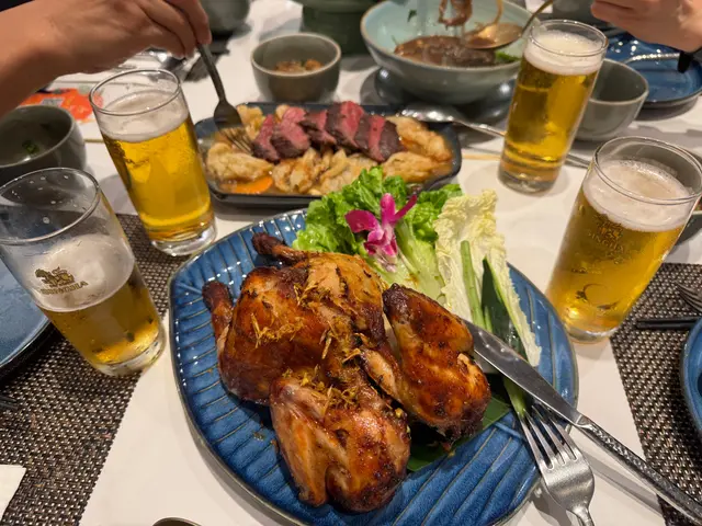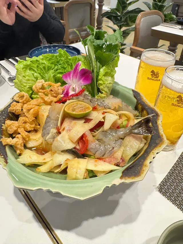 Apinara平時返工都去食,見到佢出晚市新出$10雞再送啤酒,即刻上Openrice book檯!隻香茅燒雞唔行貨,肉嫩又入味,如果個皮可以脆D就更好。當晚再叫咗幾樣嘢,最後埋單4個人$1000多D,食得好飽下! 生🦐刺身配青木瓜沙律🥗:賣相特別,係撈沙律來,生蝦口感爽口,味道清爽微辣,青木瓜切片上,感覺比切絲仲好口感。雜菜椰子🥥雞湯:選了不辣的,味道都keep到濃厚,飲完個人暖哂😊🐮封門柳炸河粉:第一次食呢個配搭,好新奇!賣相吸引,牛肉熟成道啱啱好,河粉炸過幾脆口;底下有啲汁,成件事幾夾。牛肉船麵🍜:湯頭好濃郁,所以個金邊粉都掛到汁,配料睇相就知,d肉肥瘦適中,食落估唔到咁嫰,同埋好鐘意有埋脆嘅炸豬皮😊。黃咖喱軟殼蟹🦀:初初見到仲諗點解d汁好似好乾身,唔似平時出面咁滑嘟嘟嘅,但食落又覺得ok喎,個咖喱味相對較少,甜味較突出,配埋個蟹係好夾嘅、所以忍唔係叫左Roti又叫埋個白飯食🤭P.S. 個餐仲包左🍺,個芒果糯米飯仲係半價,覺得都幾抵食呀!查看更多
