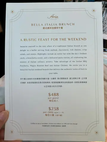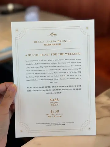 今日去左Aria食weekend brunch😋 慶祝生日Brunch時段分開左兩段時間 有早輪11:30-1:30pm 後輪1:30pm-3:30pm 兩個鐘我覺得係夠食嘅 食物方面就唔算好多選擇 不骨全部都圍繞住意大利食物 頭盤有生蠔🦪 各款芝士同火腿 意大利麵包🥖大蝦沙律 磨菇湯 吞拿魚他他 熱食方面就有烤魚 千層麵 肉丸 烤蔬菜 肉類都有燒牛肉同羊架 個人就覺得一般 主攻頭盤甜品就有多款蛋糕🍰 最signature嘅tiramisu 開心果蛋糕 檸檬蛋糕 特濃朱古力蛋糕 拿破崙 仲有生果朱古力噴泉 Overall experience 都幾好 位於中環california tower 24樓 外景都舒服 性價比各自衡量