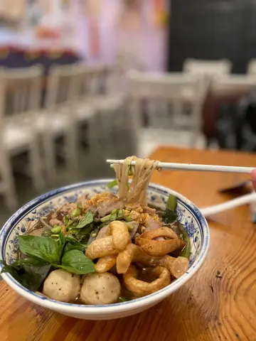 分左2間舖,一間食小菜,細D果間食粉麵,2個後生泰國男女主理,晚飯時間都係街坊look客人😆特色遊船河好濃郁的湯頭,有泰國多層次的味道,後勁帶點甜,唔會好重味精味豬潤有小小過熟豬皮同肉片同丸正正常常夜晚食飲品要加$20真係太貴無叫到,食個粉都OK