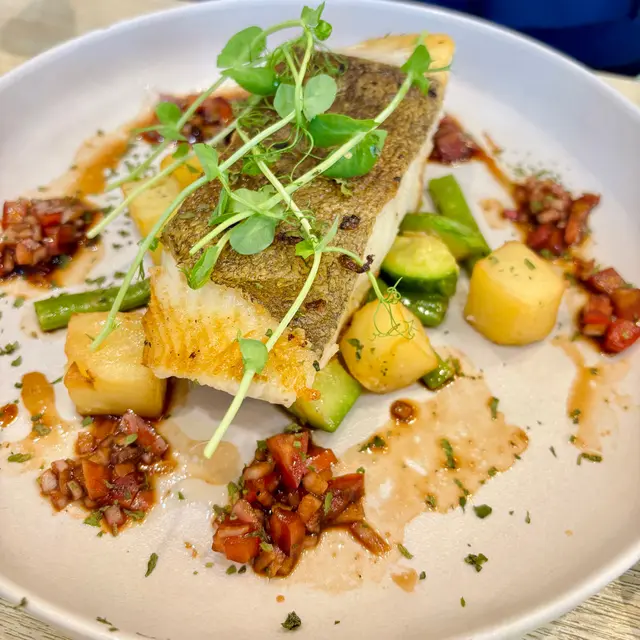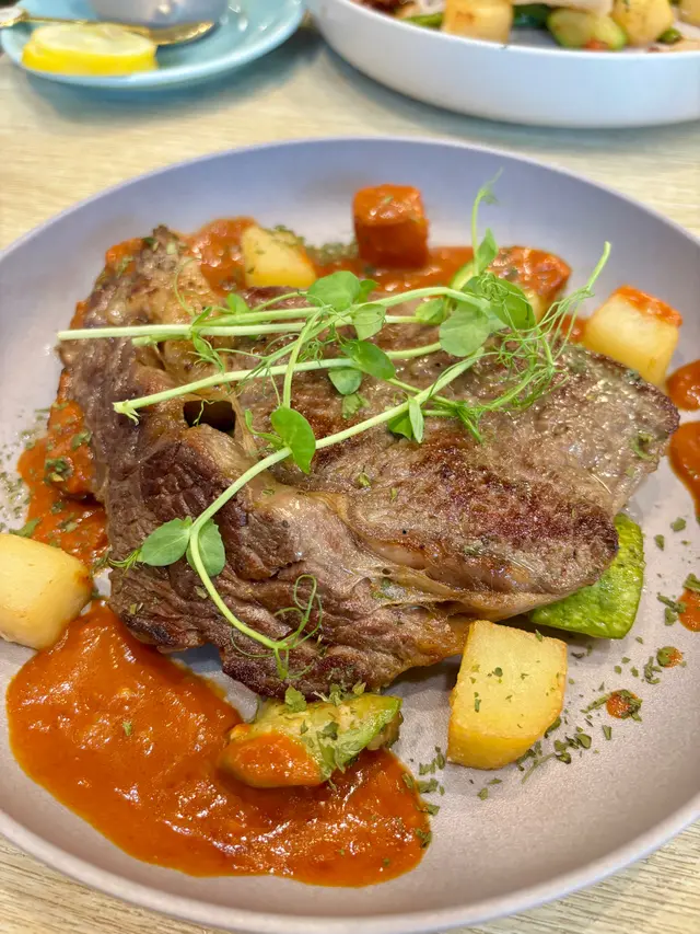 紐西蘭穀飼肉眼牛扒,香煎比目魚配莎莎醬伴炒雜菜