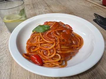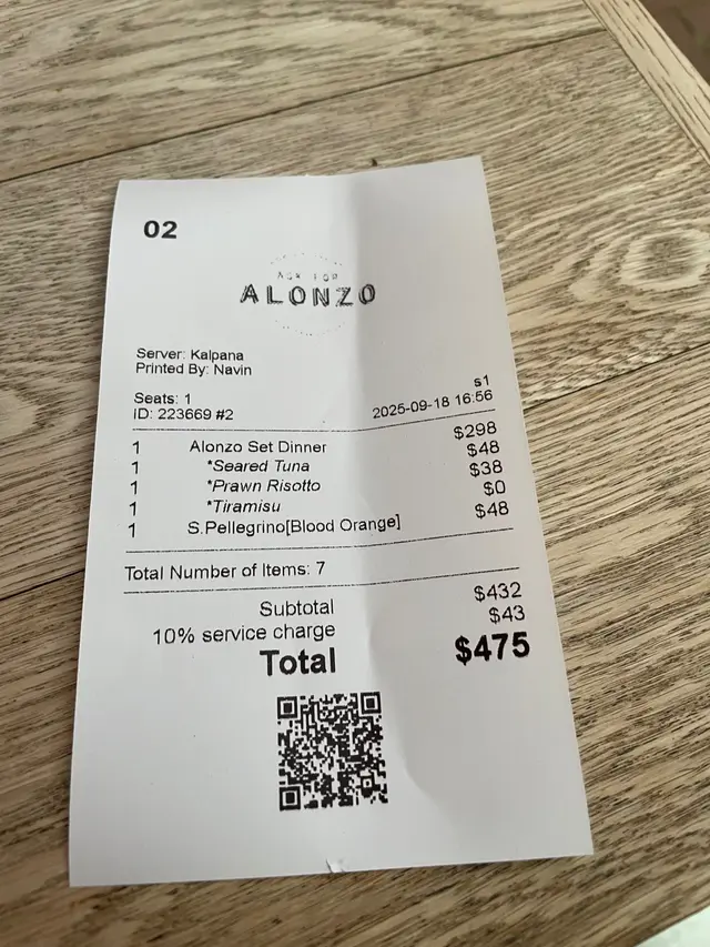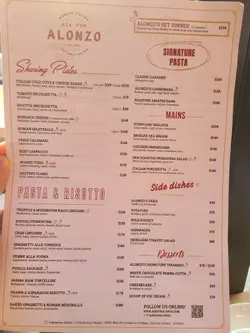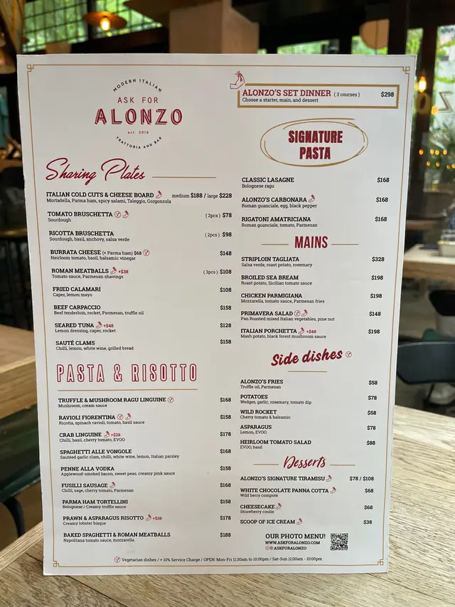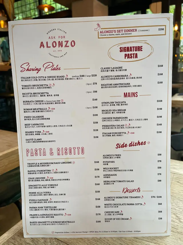 餐廳:Ask For Alonzo地點:大坑蓮花宮西街菜式:意大利近地中海省份的菜式餐牌:Set dinner$298另加一,包前菜9選1,主菜5選1或者意粉意飯12選1,同甜品4選1。某些菜式要加錢。飲品有雞尾酒,手工啤酒,咖啡茶,果汁等。麵包每人有兩款各一片,分別加有果乾同sun-dried tomato,好鬆軟,配自家製松露加巴馬臣芝士醬,食落又滑又香。Seared Tuna 加$48 另加一Lemon dressing, caper, rocket吞拿魚賣相一流,一客七片,整得都差唔多全熟,加有洋蔥碎紅椒碎同橄欖,下底墊有火箭菜沙律,伴有番茄乾同檸檬一件,加有滿滿橄欖油。吞拿魚都算嫩,沙律菜好夠油份不過唔膩,味道酸酸地,好啱悶熱夏天作為開胃菜。Roman Meatballs 加$38 另加一Tomato sauce, Parmesan shavings 羅馬肉丸用熱辣辣煎pan上枱,肉丸有牛有豬,面頭加上巴馬臣芝士醬,再加少少黑椒,下底有番茄醬。肉丸唔會死實或者過鹹,味道口感都唔錯,而芝士會拉絲,加上甜甜地番茄醬,好味道。Crab Linguine 加$28 另加一Chilli, basil, cherry tomato, EVOO非常滑溜扁意粉撈有唔少車厘茄同埋蟹肉,加有好多香草同胡椒。服務員於落單時已經提示呢道菜會有d辣,其實只係微微辣,味道帶好清新檸檬味,口感豐富,好味道。Prawn & Asparagus Risotto 加$38 另加一Creamy lobster bisque5隻燶面大蝦鹹香爽脆有海鮮味,燉飯醬汁豐富,龍蝦味夾雜好多蔬菜,包括車厘茄同蘆筍,口感味道豐富,面頭灑上香草,非常好食。CheesecakeStrawberry coulis大大件芝士蛋糕面頭加上士多啤梨醬,碟上面再加上紅莓醬同灑上糖霜。滑溜芝士蛋糕好滑,加上脆脆餅底同莓醬好美味,唔會太膩,口感似布丁。鮮蘋果汁 $48 另加一鮮蘋果汁係天然啡色,味道清甜。鮮橙汁 $48 另加一鮮橙汁有好多果肉,飲得出係新鮮。今餐前菜主菜甜品都好食,特別鍾意意粉同芝士蛋糕。餐廳環境半露天,係正蓮西宮隔離,感覺好chill。外籍服務員態度友好。…查看更多