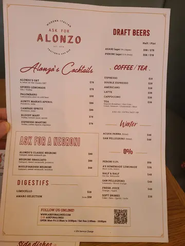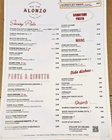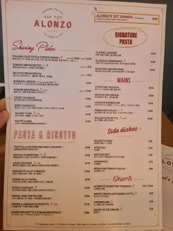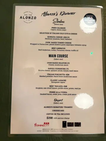 餐廳:Ask For Alonzo地點:鰂魚涌太古坊菜式:意大利近地中海省份的菜式餐牌:Set dinner$298另加一,包前菜9選1,主菜5選1或者意粉意飯12選1,同甜品4選1。某些菜式要加錢。飲品有雞尾酒,手工啤酒,咖啡茶,果汁等。麵包每人有兩款各一片,分別加有提子乾配果仁同sun-dried tomato,暖暖地,烤得好脆口,味道好豐富,配自家製松露加巴馬臣芝士醬,更加又滑又香。Italian Cold Cuts & Cheese Board Mortadella, Parma ham, spicy salami, Taleggio, Gorgonzola意式凍肉及芝士拼盤用木板仔上,三片唔同款火腿包括意式肉腸,巴馬火腿同辣莎樂美腸,配有兩片軟芝士,酸洋蔥,酸燈籠椒,橄欖同兩片香脆多士,好豐富。Seared Tuna 加$48 另加一Lemon dressing, caper, rocket吞拿魚賣相一流,一客五片,整得半生熟,加有洋蔥碎紅椒碎同橄欖,下底墊有火箭菜沙律,伴有新鮮車厘茄同檸檬一件,加有滿滿橄欖油。吞拿魚都算嫩,沙律菜好夠油份不過唔膩,味道酸酸地,好啱悶熱夏天作為開胃菜。Crab Linguine 加$28 另加一Chilli, basil, cherry tomato, EVOO非常滑溜扁意粉撈有唔少車厘茄同埋蟹肉,加有好多香草同胡椒。服務員於落單時已經提示呢道菜會有d辣,其實只係微微辣,味道帶好清新檸檬味,口感豐富,好味道。Prawn & Asparagus Risotto 加$38 另加一Creamy lobster bisque5隻燶面大蝦鹹香爽脆有海鮮味,燉飯醬汁豐富,味道酸酸微辣,龍蝦味夾雜好多蔬菜,包括車厘茄同蘆筍,口感味道豐富,面頭灑上香草,非常好食。CheesecakeStrawberry coulis大大件芝士蛋糕面頭加上士多啤梨醬,碟上面再加上紅莓醬同灑上糖霜。滑溜芝士蛋糕好滑,加上脆脆餅底同莓醬好美味,唔會太膩,口感似布丁。Scoop of Ice Cream今日有雲呢拿味,用一個雪糕杯裝住,肉眼都見到有粒粒雲呢拿籽。A's Homemade Lemonade $38 另加一檸檬水加有薄荷葉同檸檬一片,薄荷味好香。鮮蘋果汁 $48 另加一鮮蘋果汁係天然啡色,味道清甜,好好飲。今餐前菜主菜甜品都好食。餐廳環境舒適。外籍服務員態度友好。…查看更多