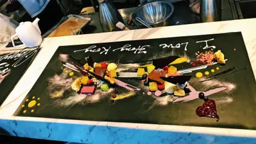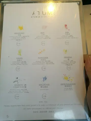 個日係女朋友生日就去左呢間atum食,一開始都聽過佢個名有得畫畫呀又剩既,但係自己係藝術白痴又點會呀,好釆個日佢都幫我地完成曬。環境非常之靚又安靜,坐低之後會有一位你個晚專屬既師傅招呼自己,之後佢就俾你係三種顏色分別係白,黑同灰,我地個晚就揀左白色因爲感覺好乾淨,之後師傅係上面加下顏料啫喱呀朱古力呀係上面,加之前都會俾我地試下味咁,係全部都食得,最後幅畫就好似圖中咁好靚而味道都十分不錯,雖然自己唔鐘意食西式甜品但見到咁用心咁靚,最後都俾心機食,食到最尾都食.....唔曬