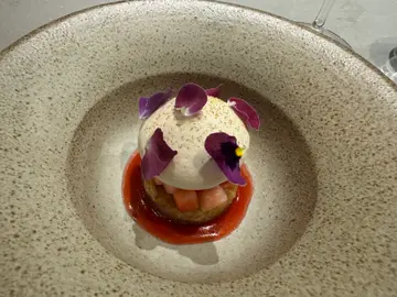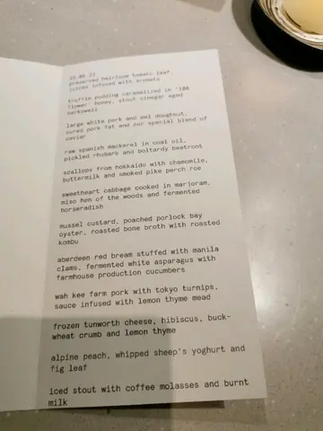 This Simon Rogan’s restaurant is just on the side of Roganic, the Michelin 1-star, and is serving as the development kitchen and chef’s table for customers to enjoy an intimate and interactive dining experience with the chefs, showcasing local ingredients in the cuisine.Arriving early, we are seated at the lounge outside to enjoy a cocktail while the chefs are in preparation. And sharp at 7pm all the guests are taken into the 12-seat chef’s table where the chef is busy getting ready with his sous chef.The tasting menu is priced at $1,380 and the premier wine pairing at $1,180. To start, I order an extra glass of Champagne Lombard Brut Nature Grand Cru Blanc de Blancs ($240). Made with Chardonnay grapes from the grand cru villages and aged for 48 months in bottle, it has a crisp vibrancy highlighting a chalky mineral tone. Good for getting the palate energized for the foods to come.The first three servings are bite-size snacks, starting with Boltardy Beetroot Tart, with the chef using the beetroot to make a puree to add to diced raw Spanish mackerel that has been aged for two days, then drizzle with some coal oil. Rich in umami, on the top is pickled beetroots with young shoots and flowers. The pickles have a nice acidity to stimulate the appetite and matches well with the taste of the mackerel.The second is Roasted Three Yellow Chicken Skin, with the skin of the local chicken baked to wonderful crispness and holding some whipped chicken livers, offering a creamy texture and rich taste. The chef also added some preserved lingonberry, a type of small berries reminiscent of cranberry, but with slightly more bitterness and less tartness. Good enjoyment with contrast on the bite, and the lingonberry cleverly used to balance the rich liver pate. The third one is Truffle Pudding, with the homemade bread pudding is made using croissant to provide a more buttery note, with the surface caramelized in birch sap syrup. Inside are some black garlic emulsion and stout vinegar to give a sweet and savoury taste, plus plenty of shaved aged Westcombe cheddar cheese on top. Another example of the chef’s ability to integrate the different flavours into a complex but highly appealing snack.After the snacks the first appetizer is Yuniu Young Tomatoes with Set Sea Urchin Cream. The presentation reminds me of Japanese chawanmushi, with a layer of tasty custard infused with sea urchin and lobster meat at the bottom. On top are locally grown small tomatoes, including both dried and fresh ones, which have been marinated with lemon sugar and tomato ponzu. In the middle is the special blend of caviar to add an extra dimension of umami and savoury.To pair with the sea urchin cream, the sommelier prepares the sake 木陰の魚 from 嘉美心酒造 in Okayama. Unlike the typical sake, this one is more reminiscent of a white wine, with nice lactic acidity and exhibiting fruity notes of melon, peach, and summer fruit. Good match with the custard and sea urchin.The second course is Grilled Brassicas. The baby lettuce has been seared with brine to highlight its original delicate taste, and supplemented with some pickled shimeji, with the chef only using the top part of the mushroom. Together with a winter truffle puree to provide a bit of earthy tone, as well as the creamy fermented horseradish puree on top, this veggie dish demonstrates how the vegetables can combine to provide amazing texture and intense flavours in the hands of a good chef.The wine paired is Chateau Brown 2021 from Pessac-Leognan. This Bordeaux white wine has beautiful aromas of pomelo and lemon peel, with floral notes of honeysuckle. Fresh and round, the crisp grapefruit and green apple flavours are good match with the horseradish puree and shimeji mushroom.The third course features Scallops from Hokkaido. The large circular shape of the scallop is formed by stacking the scallops before cutting into slices. On top there are smoked pike perch roe, with the poppy fish roe giving an interesting contrast in the bite. Scattered with some chamomile powder, the creamy buttermilk sauce has been supplemented with mustard to good effect.The wine paired is Domaine des Marnes Blanches Savagnin Les Molates 2021, from the Cotes du Jura appellation. The wine is aged in old foudres for 11 months, with a classic lemon and saffron flavours, as well as some bitterness on the aftertaste. The Savagnin is a nice pairing with the scallop, matching well the heavier body of the buttermilk sauce.The fourth course is Poached Grouper from Aberdeen market. With some tapioca and cabbages cooked in whey at the bottom, the fish is seasoned appropriately to enable its delicate taste to shine through. At the same time the chef has grilled some king oyster mushroom, fermented for two days, brushed with XO sauce before slicing them up and put on top of the fish medallion, before pouring a Kuruma shrimp foam blended on the spot, to provide a rich, intensely flavour.Interestingly, the wine paired is a red wine from Tuscany, Le Chiuse Sferracavalli Rosso 2022, served slightly more chilled than usual. The Sangiovese has a sweet raspberry note and its earthy characters match well with the king oyster mushroom. A perfect complement with the shrimp sauce too. I am surprised it does not mask the taste of the grouper or making it unnecessarily fishy.The fifth course features Three Yellow Chicken. The chicken breast is poached to retain its tenderness, then browning the skin to give a bit of caramelization, while the thigh has been cooked in confit method using the chicken fat. Mix and match with the local grown Sweet Jean corn, the puree is rich in taste and sweet, with a piece of the corn roasted to go along. Together with the preserved nasturtium, some garlic oil, and a rich and super delicious roasted bone and fats sauce, it is a amazing.The wine paired is Abrigo Giovanni Barolo Ravera 2016. With rich red fruit notes of cherries, plum, and raspberry, plus nice floral perfume characters