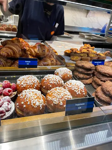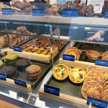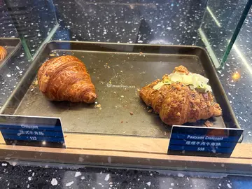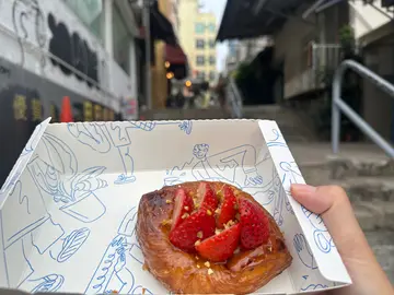 1、酸种蛋挞(Sourdough Egg Tart)价格:12港币/个 推荐指数:★★★★☆ 外观:焦糖斑纹的深褐色表面,褶皱酥皮包裹饱满挞芯,形似小型焦糖布丁。 口感:热食:酥皮如可颂般轻薄松脆,层次分明(约144层开酥工艺),挞芯呈半流心状,奶香浓郁带焦糖尾韵; 冷食:酥皮吸湿后转为千层蛋糕般的绵密,挞芯凝固为布丁质地,甜度更集中。 不足:个别分店出品不稳定,塔底偶有未烤透的湿软面感(尤其放凉后)。 总结:香港蛋挞天花板名不虚传,但务必趁热吃!冷吃体验降级明显。🥯 2. 咸蛋黄菠萝包(Salted Egg Yolk Pineapple Bun)价格:约28港币/个 推荐指数:★★★★★ 内核:整颗咸蛋黄碾碎后混合黄油酱,咸香沙感突出,咬开呈熔岩状爆浆,蛋黄油脂香与微咸平衡得恰到好处。 外皮:传统菠萝包脆皮升级版,撒满酥粒,甜脆外壳与咸馅形成强烈对比。 惊喜点:白胡椒微量提鲜,巧妙化解腥气,比市面同类产品更细腻。 总结:颠覆传统甜菠萝包的创新之作,咸甜党必试,热量炸弹但值得!🥐 3、草莓牛角酥(Strawberry Croissant) 价格:38港币/个 推荐指数:★★★☆☆ 结构:酥皮开孔均匀,内填自制草莓果酱与卡仕达酱,顶部装饰鲜草莓片。 风味:草莓酱酸甜清新,但果香偏淡;卡仕达酱奶味过重,略盖过草莓本味。酥皮黄油香依旧出色,但馅料融合度一般。 对比:不及限定款提拉米苏丹麦酥咖啡酒香奶油与酥皮更和谐,爆浆感十足。 总结:颜值高于内涵,适合拍照,味觉体验中规中矩。🍫 4、巧克力牛角酥(Chocolate Croissant) 价格:32港币/个 推荐指数:★★★★工艺:使用法国🇫🇷有机面粉+澳洲黄油,酸种发酵赋予酥皮微酸底蕴,抵消甜腻。 内馅:黑巧克力条卷⼊酥皮烘烤,融化后形成 pockets of chocolate,微苦可可香与酥皮黄油味交织,层次高级。 总结:教科书级牛角酥,巧克力控闭眼入!