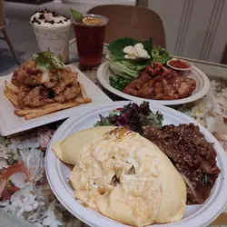 成年冇返香港, 約左港島朋友黎哩度食晚飯, Banchan其實以前都去過佢地分店, 野食唔錯, 不過好多人同限時, 今次黎太古哩間分店雖然係自助形式, 野食餐具清水全部要自己拎, 不過勝力唔限時可以慢慢坐慢慢傾, 而家要搵一個咁嘅地方食飯都唔容易~座位闊落舒服餐具紙巾同水都係自己出去拎野食係自己去收銀度落單, 之後俾個電子籌, 電子籌響就自己出去取餐烤牛肉蛋包飯($98) - 雖然哩度嘅蛋包實際係將蛋放喺飯上面,不過蛋都好滑,烤牛肉好腍冇筋。蛋包飯份量好大份,絕對夠兩個人食。燒醬油黑毛豬白切肉配大醬生菜($182) - 黑毛豬夠厚切醃得好入味,肥瘦適中,生菜新鮮爽脆,包住食冇咁油膩。無骨柑橘炸雞($108/半份) - 第一次食哩個口味,食得出柑橘酸甜味,幾清新都唔錯,下面仲有少少薯條同年糕。提拉米蘇($68) - 同平時嘅tiramisu有啲唔同,係加左紅豆同朱古力碎,質地濕軟都唔錯,估計冇落酒,大人細路都啱。溶化朱古力($42) & 水蜜桃茶($42) - 野飲正常發揮,相對野食性價比冇咁高。哩個價錢哩個質素雖然都有好多選擇, 不過要唔限時真係唔多,所以想同朋友搵個地方可以慢慢食慢慢傾都係唔錯嘅選擇。…查看更多