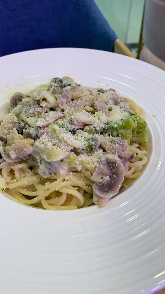 叫左西蘭花磨菇蜆肉白汁意粉。好大份量,女仔可以share,再跟湯。味道偏淡,冇乜芝士味,下次都係叫返煙肉應該冇咁齋。總括,坐得舒服,麵包同意粉都幾好味,下次再黎。
