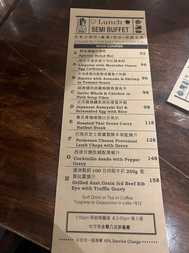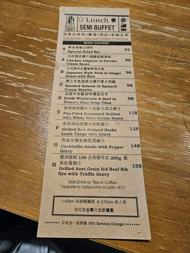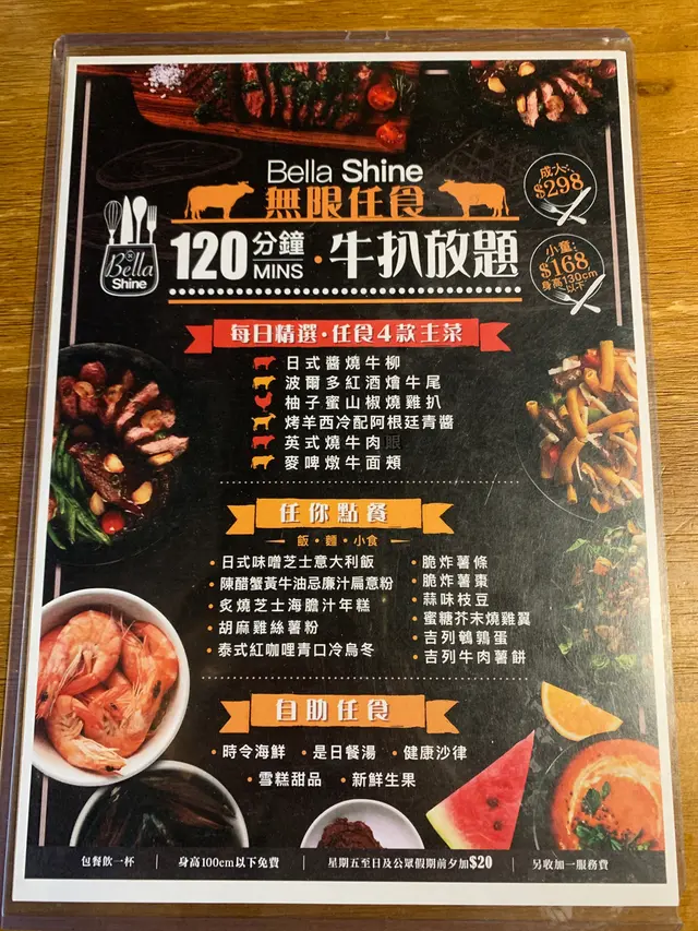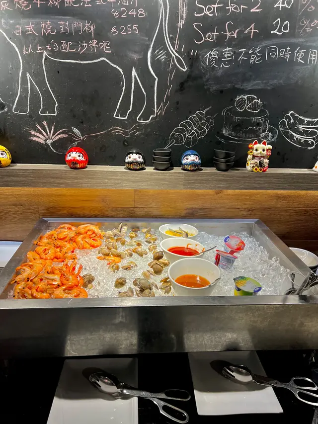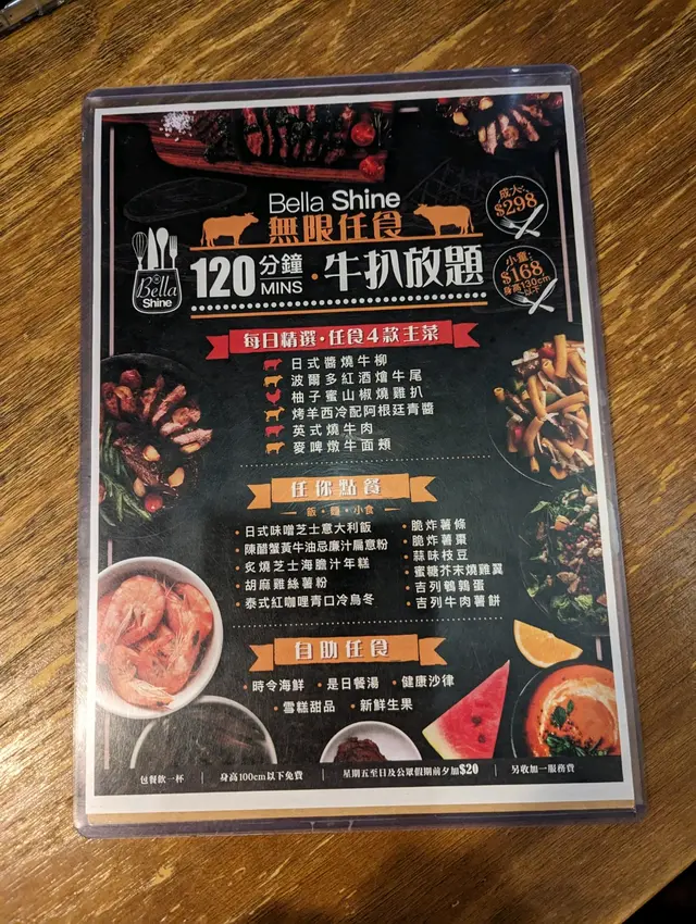 120分鐘牛扒放題 $328 (已包加一),簡直係食肉獸嘅天堂!日式醬燒牛柳肉質鮮嫩,帶有微妙的甜味,入口即化。麥啤燉牛面頰濃郁的啤酒湯底燉煮,肉質軟嫩,滋味十足。烤羊西冷配阿根廷青醬羊肉烤得剛剛好,搭配著香氣四溢的青醬,口感和味道都非常棒。泰式紅咖哩青口冷烏冬係清新的口味體驗,咖哩的香辣風味和烏冬的彈牙口感完美融合。陳醋蟹黃牛油忌廉汁扁意粉扁意粉的醇厚忌廉汁與蟹黃的鮮味交融,味道豐富。吉列鵪鶉蛋鵪鶉蛋為主角,口感鮮嫩,搭配著綿密的蛋液,美味可口。脆炸薯條脆炸薯條炸至金黃酥脆,是完美的開胃小食。蜜糖芥末燒雞翼甜中帶點微辣,口感鮮嫩多汁。…查看更多