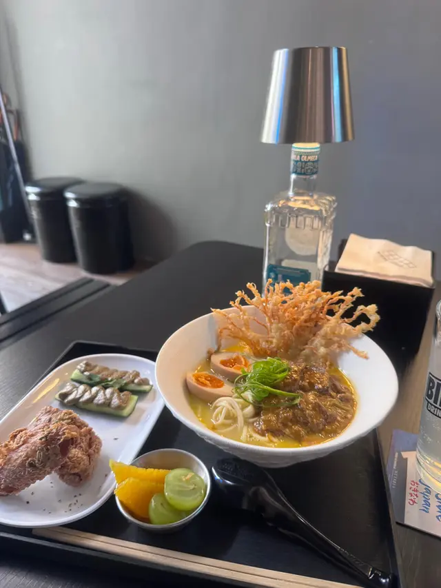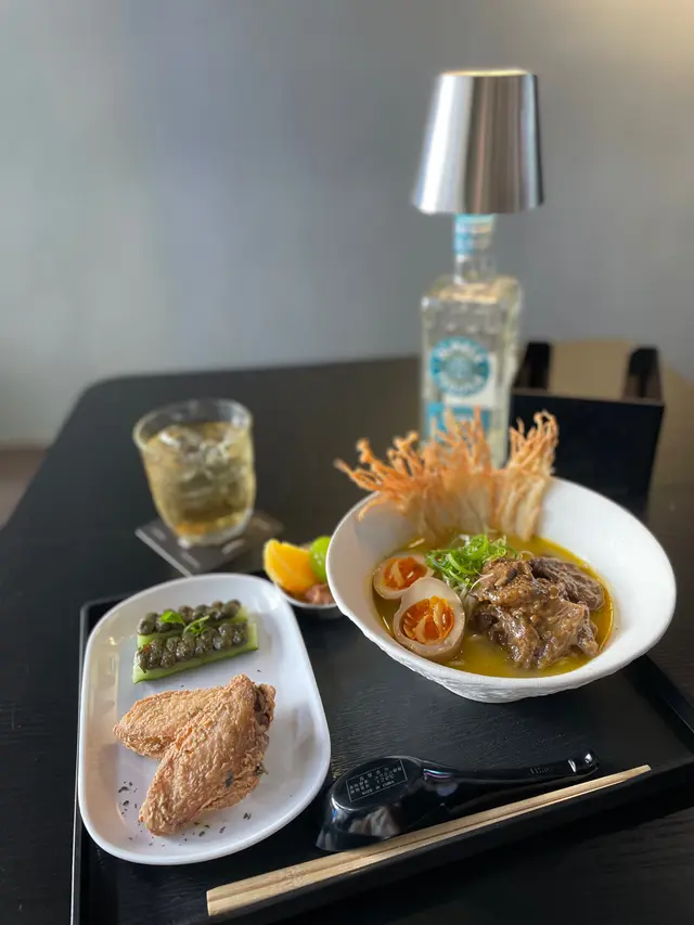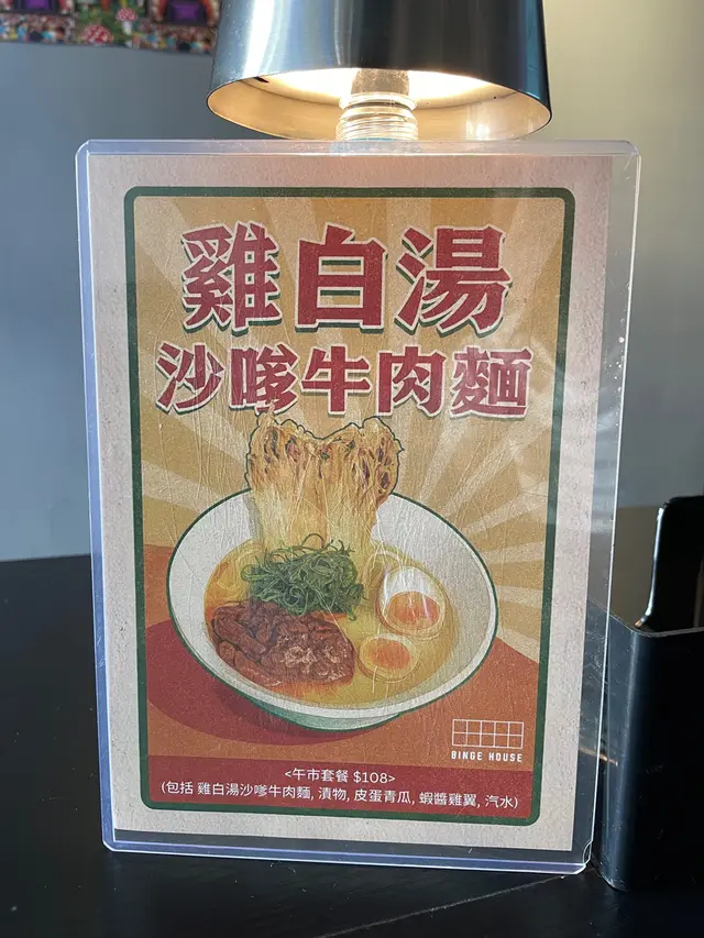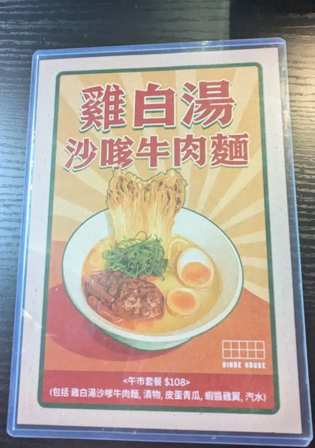 ,看來頗特別,又正值午飯時段,正好在此小休加吃個午餐。踏入餐廳,地方不大,裝修簡約,整潔企理。原來小店是一家酒吧,因為一入門口右邊就設了一個生啤凍櫃,飲品板上又列出很多酒精類飲品。午市就只有一款「雞白湯沙嗲牛肉麵」套餐,還包括漬物、皮蛋青瓜、蝦醬雞翼及汽水,賣$108。此外,還供應很多下酒小菜,不過,就未有問及是否全日供應。由於午市只有這一款套餐,與友人也是吃這個了,不過,漬物就換了成生果,也是,吃得健康。先呷一口湯,比起豬骨湯,雞白湯香濃得來較爽口