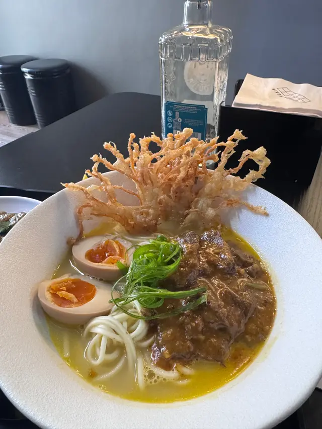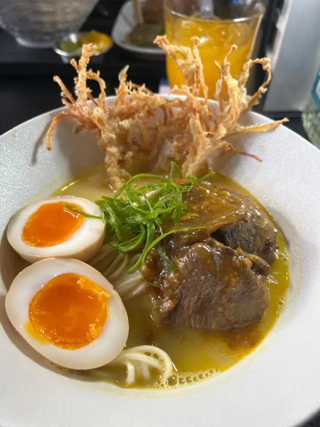,之後再將沙嗲跟湯拌勻,更添一份濃郁的惹味感,而麵條很排湯,有筋性,很不錯;牛肉軟腍,又富肉香,還伴有脆口的天婦羅金菇及香濃的溏心蛋,實在做得有誠意