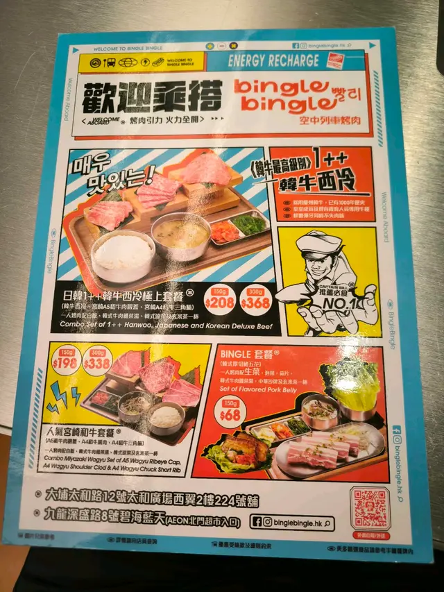 Bingle Bingle 空中列車烤肉 (太和廣場西翼) (太和) 網址: https://s.openrice.com/QrbS0mly600 地址: 香港太和大埔太和路12號太和廣場西翼2樓224號舖 電話: +852 26790122
