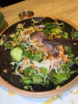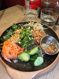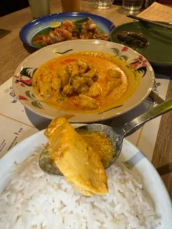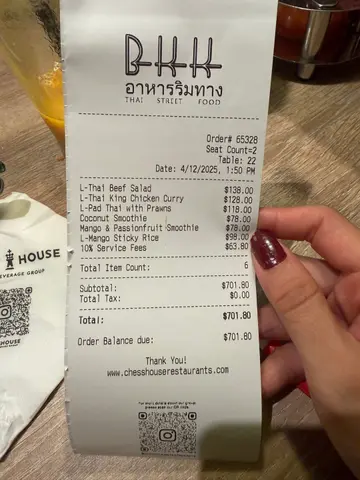 BKK原來PMQ入邊有一間隱世泰國菜,環境泰式復古風格,仲有好多泰式嘅街頭小食,店舖門面非常大入邊仲有大量嘅卡位,坐得舒服又食得舒服炭燒封門柳沙律配米粉跟特色醬汁$138炭燒澳洲牛肉煮到八成熟,入口淋身,牛肉味香濃,切到一片片容易入口,青瓜大大粒,爽口鮮甜,配埋蔥,芫荽,蕃茄一齊食更加好味,全部撈埋一齊食好好味虎蝦金邊粉$118炒金邊粉有虎蝦,芽菜,花生,羅網子醬,鮮甜新鮮的虎蝦肉質鮮嫩,金邊粉柔韌,經過炒後虎蝦香氣撲鼻,金邊粉煮至剛好,吸收了湯汁的精華,滑順的口感,虎蝦鮮甜爽口彈牙,十分美味泰皇咖喱雞配白飯$128芬芳的咖喱香,椰子醬,泰皇咖喱雞醇厚的咖喱香,濃郁咖喱醬汁,入口滑順的口感,還帶有甜味,雞肉十分嫩滑,吸收了咖喱的精華,肉質鮮美、口感豐滿,白飯吸收咖喱的醬汁,每一口都十分美味芒果椰汁糯米飯新鮮的芒果肉質香甜多汁,與糯米飯的綿軟融合,入D濃厚的椰子味,糯米飯經過蒸煮,口感柔軟而粘稠,加入椰汁的糯米表面濃郁的椰子香味,芒果清新香氣和椰汁的濃郁清甜,糯米的黏滑和芒果的酥軟香甜Coconut Smoothie這杯椰子特飲,用上天然的椰子汁,加上新鮮生果,入口非常清新好味Mango & Passionfruit Smoothie用上新鮮的百香果和芒果榨汁而成,入口非常香甜,清新好飲…查看更多