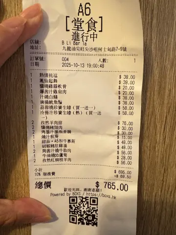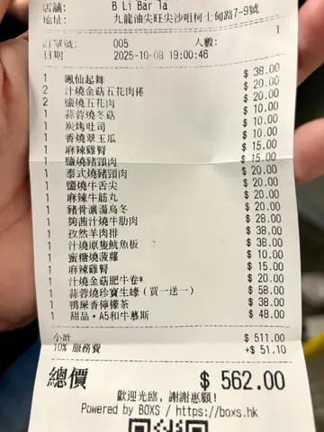 孜然紅柳枝羊肉 HKD15,羊肉都不錯,帶少許孜然香味。礦資七里香 HKD15,非常脆口,送酒一流。夠流汁燒牛肋肉 HKD28,牛肋肉醬汁很入味,又香牛肉味。蒜蓉燒生蠔用拔 HKD24,沒想到大大隻生蠔,蠔肚非常肥大,加了蒜蓉,更加美味,也是必吃之選。