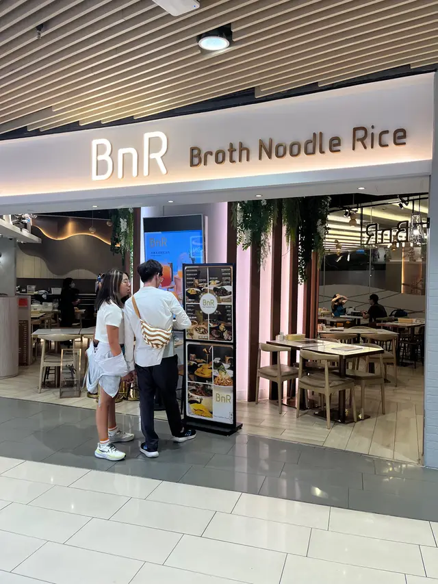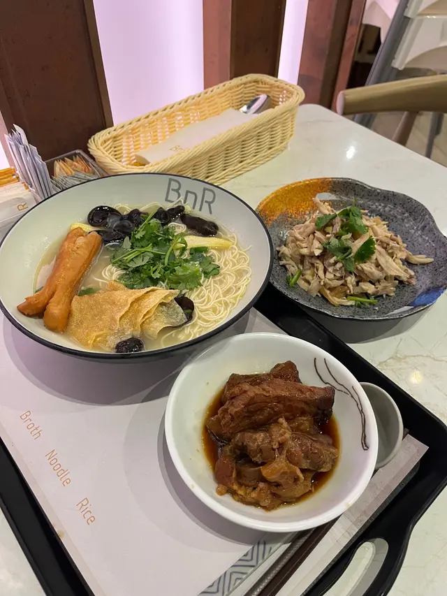 👧🏻😋👅🍽✨Megabox高質濃湯米線籠仔飯😎-🥢 BnR全寫係broth, noodle and rice, 米線有雞湯/魚湯, 另有籠仔蒸飯, 不同小食同多款特飲🥢 雖然QR code落單都要收加一, 但佢環境的確唔錯, 品質好而價錢都唔算十分進取, 都可以接受-🍲金銀蒜籠仔蒸黑毛豬排骨飯 $128💯即叫即造製作需時, 黑毛豬排骨份量好多鋪滿飯面, 排骨連骨有筋腩位有咬口, 肉既部份都少少偏肥, 肉汁滿滿又冇整腍晒D飯💯金銀蒜鹹香惹味, 欣賞佢冇落薑絲但因為排骨新鮮冇雪味, 淨係蔥蒜都已經夠晒香口, 個飯仲有炒蛋底更豐富-🍜濃雞湯牛魔皇湯麵 $84 加油炸鬼 +$3✨牛筋腩另上保留腩汁原味, 亦唔會同濃雞湯撈埋晒, 細細兜有5件牛筋3件腩非常唔錯! 每件都好腍好入味, 可免費轉淮山麵, 幼身而彈牙, 同米線一樣咁滑✨濃雞湯清清地唔油膩但好鮮甜, 配少量腐皮, 粟米仔, 雲耳, 芫茜, 加左油炸鬼新鮮即炸, 浸一浸湯外脆內軟-🐥 海哲手撕雞 $56💯只有少量青瓜墊底, 其他大部份都係主角, 幾大兜都好抵食; 手撕雞好滑! 麻油味好香查看更多