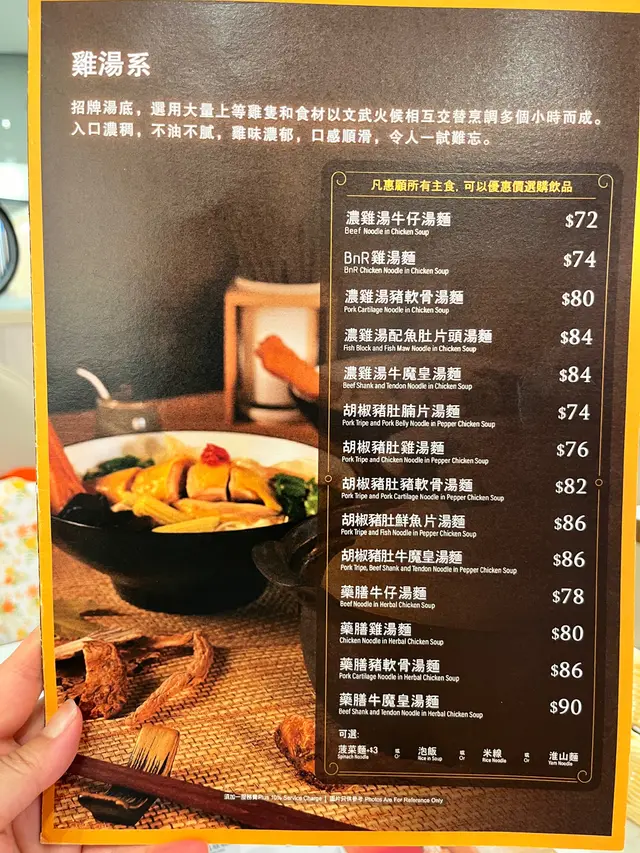 今日去咗九龍灣Megabox一樓嘅BnR 湯飯店食晚飯。入去見樓面都幾大幾多位,坐低都幾舒服。雞湯系佢哋嘅招牌湯底,佢寫用大量上等雞隻和食材以文武火候相互交替烹調多個小時而成。所以我就試咗個藥膳雞湯麵 -配淮山麵,入口濃稠,不油不腻,雞味濃郁,口感順滑,仲明顯有藥材味雞嘅份量都幾多另外再叫咗個牛魔皇飯(牛筋牛腱),牛筋煮到腍晒,牛腱都幾爽口。再叫多咗杯青提梳打飲,跟餐平少少,有幾粒提子喺裏面另外仲點咗冷拌四小碟:裡面有豆腐皮蛋,麻辣腩片,泡椒雞翼尖,海哲手撕雞四樣嘢,份量都唔少,豆腐皮蛋個蛋黃夠晒鮮味,麻辣腩片夠辣夠麻,泡椒雞翼尖個辣味後勁過足癮,海哲手撕雞夠晒惹味。呢餐咁多野夾埋先至3百幾蚊埋單,過足口腹之欲。查看更多