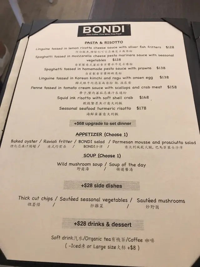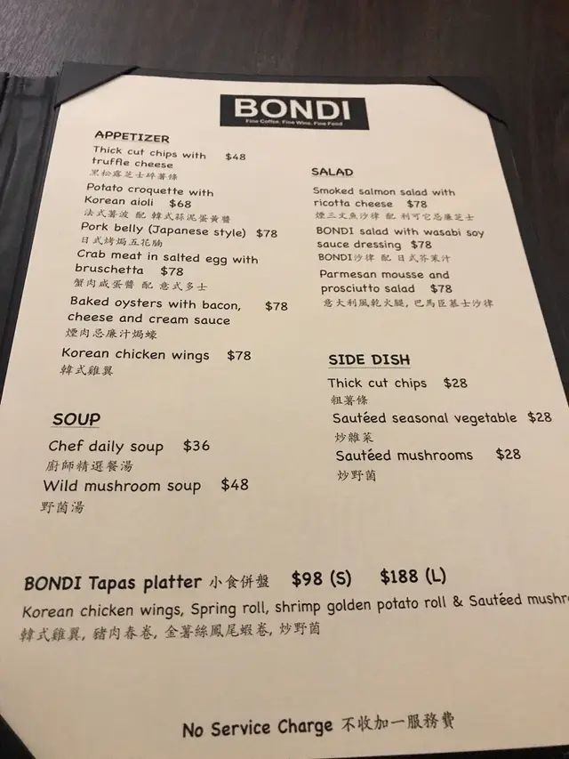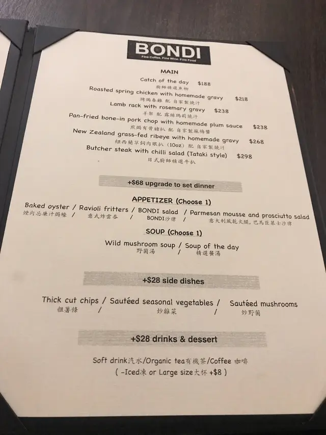 去完d2 place行完次次都唔知食咩,通常都係亂行搵間岩心水,咁今次就係地鐵站附近既工廈見到有間叫bondi既西餐廳,咁就上去試下。環境幾闊落又夠靜,幾岩情侶黎食,首先先叫左個湯,好香好有菇味,然後重有個沙律,好足料,有我最喜歡既芝士醬加巴拿馬火腿,我個人就最鐘意食芝士醬,呢個沙律夠哂多醬,生菜同火腿沾左啲芝士醬超好味。食完沙律開左個胃就準備食主菜,咁食西餐就緊係食排啦,叫左個五成熟既肉眼扒,好林,好有肉味,平時食排好驚好乾好難咬,但呢度煎得岩岩好,好好食。最後就係甜品,心太軟,好喜歡一叉落去有朱古力滲岀黎既感覺,而呢度既心太軟甜而不膩,唔錯,大滿足…查看更多