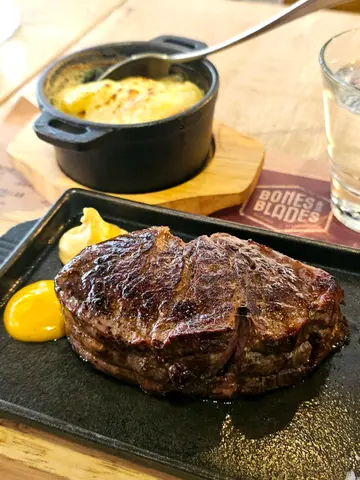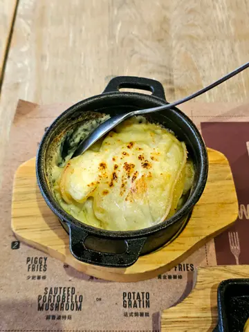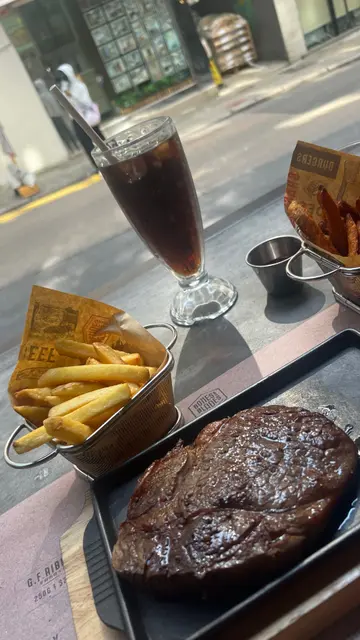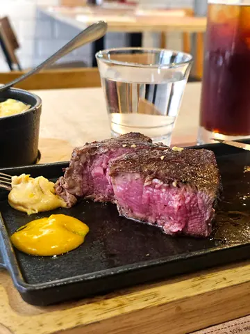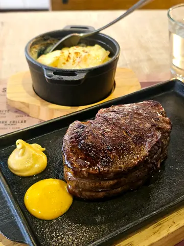 食晏時間行左去西環,隨意簡左哩間食扒嘅餐廳試下。當時舖内已經冇位,諗住走嘅時候,職員話隔離嘅肉舖都係佢哋嘅,於是就安排我哋坐响肉舖出面個bench 度坐。對住條街食,感覺幾得意。Set lunch 包side dish,main 同野飲。我哋分別order左佢個rib eye同Sirloin。佢哋啲肉都係即時响佢哋個肉檔切出黎,唔知係指定動作定係職員順路行過俾我哋過目一下啲生扒,再拎去煮。先嚟side dish 炸甜薯, 佢哋炸得好好食,甜薯外層炸得好乾身,但入邊仲好濕潤,而且蕃薯非常甜,食到停唔倒口。 牛排一上已經香氣撲鼻,分量好足,食落牛味非常濃郁,雖然我哋order medium rare 而佢係有啲overcooked,但係肉質依然好腍,要挑剔嘅只係有啲筋。我哋覺得SIRLOIN係好食過RIB EYE。…查看更多