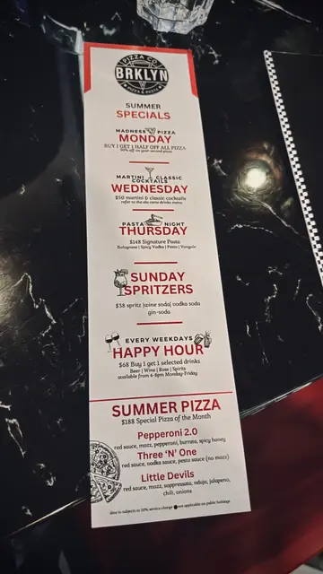 今天我和朋友到了位於中環蘇豪區的一間特色pizza餐廳,這家店不僅提供美味的披薩,更有著獨特的裝潢和氛圍,彷彿置身於一間時尚的美式酒吧之中。。首先,我們被餐廳的外觀所吸引 - 門口設有室外用餐區,讓人感受到悠閒的氛圍。踏入大門,映入眼簾的是一個酒吧區,燈光昏暗,營造出典型的酒吧風格。這種融合了餐廳和酒吧元素的設計,讓整個空間充滿了活力和個性。。餐牌上每天都有不同的優惠,而今天剛好是星期一,可以享受第二件pizza半價的優惠,實在是太棒了!我們毫不猶豫地點了兩款pizza。。第一款是Pepperoni 2.0 ($188),配料包括紅醬、馬蘇里拉芝士、意式辣香腸、馬鈴薯和香辣蜂蜜。這款Pizza色香味俱全,辣香腸的辣味與甜蜜的蜂蜜完美融合,口感層次豐富,讓人欲罷不能。。另一款是Rocket Projoot($198),配料包括番茄醬、芝麻葉沙拉、巴馬火腿、帕爾馬芝士和羅馬芝士。這款PIZZA更加清新爽口,芝麻葉沙拉為整個披薩增添了清新感,而火腿和芝士的鹹香則帶來了飽滿的口感。。除了PIZZA,我們還點了前菜Burrata Caprese($148),裡面有新鮮的布拉塔芝士、時令番茄和芝麻葉。這道前菜清新爽口,為整頓餐點增添了開胃的味道。。飲品方面,我們點了兩款無酒精雞尾酒。第一款是sweet sunrise mocktails ($58),由鳳梨汁、橙汁和石榴蘇打水調製而成,清新甜美,非常適合夏日享用。另一款是passion fizz lemonade ($68),由新鮮百香果果泥、檸檬汁和薑啤調製,酸甜可口,清涼爽口。。最後,我們點了Tiramisu作為甜品。這道經典的意大利甜點濃郁香醇,奶油與咖啡的完美結合,為整頓餐點劃上了完美的句號。。總的來說,這家餐廳不僅提供美味可口的pizza,更有著獨特的裝潢和氛圍,讓人彷彿置身於一間時尚的美式酒吧之中。從前菜、主菜到甜品,每一道菜品都讓人流連忘返。。BRKLYN Pizza Co.中環蘇豪俊榮里5號地舖。#hkfood #hkfoodblogger #hkfoodie #hongkongfood #foodie #foodporn #likeforlike #followforfollow #central #soho #centralfood #hklocalfood #italianfood #newyorkfood #pizzaestaurant #brklyn #香港美食 #美食 #中環美食 #中環食乜好 #香港地道 #意大利菜