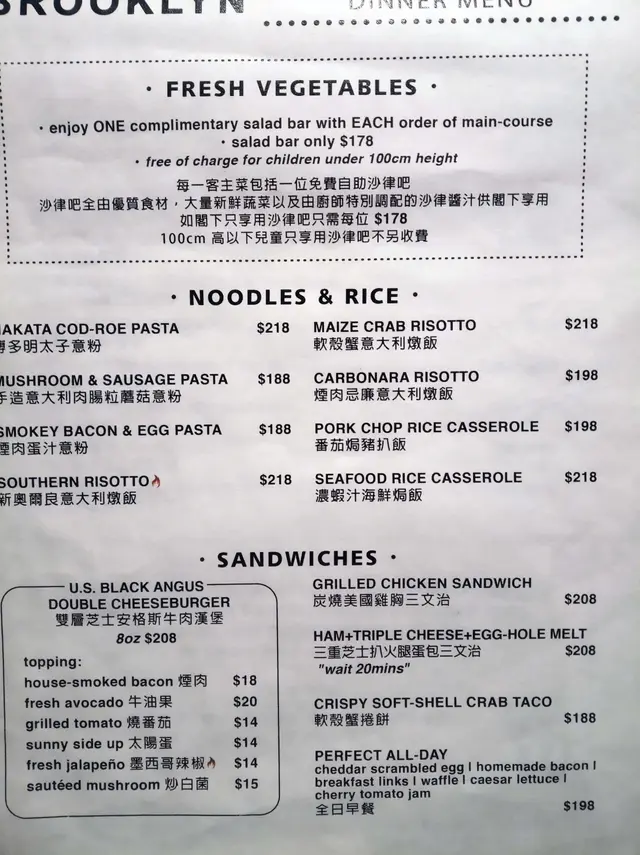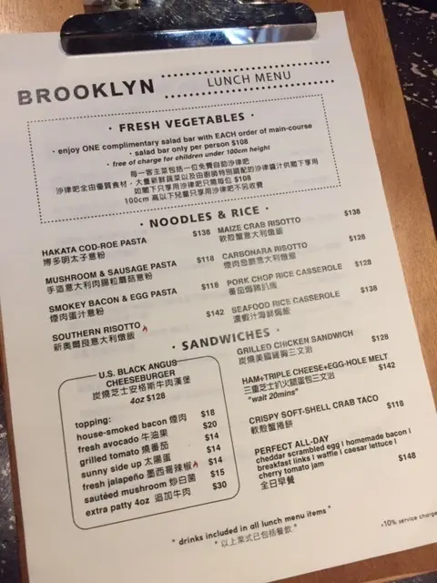 環境舒適 音樂不太大聲 但整體餐廳燈光偏暗店員服務態度較hea吃了Brooklyn三年 第一次寫食評 見證它的加價😂 餐牌變動 由普通沙律前菜變自助沙律吧 serving plate由黑色iron skillet變銀色餐碟博多明太子意粉 $138普普通通 明太子味不夠濃烈 有少量三文魚子和少少量海膽 (海膽吃不慣 以為自己吃一整個漁市場落肚) 量少 但有自助沙律吧填肚子炭燒美國雞胸三文治 $128沒有拍照💁🏻♀️ 但賣相很不錯雞胸有炭燒的格子紋 吃得到炭燒味(其實我也不知道甚麼是炭燒味 但隱約就是有那股味) 肉完全不柴 非常juicy 醃得入味 我就覺得有點點鹹 非常適合重口味人士 比較特別是中間有半個切片牛油果及羽衣甘藍 沒有薯條之類的伴碟(沙律吧有!)自助沙律吧🥗單點沙律吧$108 但$118就己經有甚麼軟殼蟹包 所以不用我說 你也知道我想表達甚麼吧😏沙律菜有三四類 但看起來不太新鮮 🥫有醬!八大種耶!🌽有水果!菠蘿!🥓有肉!salami!🧀有芝士!大大粒巴馬臣 車打芝士碎(伴沙律用) 🍘有炸物!普通薯條 黑松露粗薯條 炸雞(脆但是是硬的脆🌽有澱粉!粟米粒(應該是罐頭的) 蒜香多士(配湯吃)🥘有湯!蘑菇和(好像是)蕃茄種類少 但勝在樣樣都啱食 啱我食🥴…查看更多