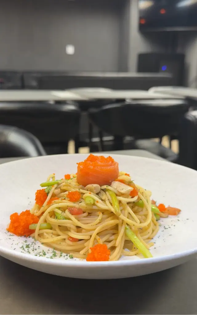 蟹籽、蘆荀、煙三文魚伴香蒜橄欖油意粉