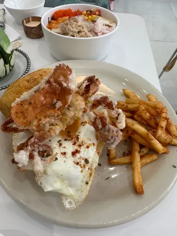 軟殼蟹菠蘿包配薯條個菠蘿包既包面有啲濕,不是很乾身很脆的類型,包體麵係偏濕潤。軟殼蟹炸得很金黃香脆。配搭配料及醬汁,味道非常之有吸引力。薯條是香脆惹味的,整體來講都唔錯。Bunphant bowl 呢個蓋飯有好多配料,包括有蟹肉蟹子。手絲雞肉,溫泉蛋等等。加咗個汁撈混之後有種酸酸甜甜嘅味道,挺好味的。開心果手調特飲外型唔錯,有淡淡開心果味,牛奶味比開心果味濃。