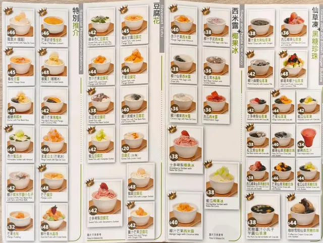 餐牌上主打多個系列甜品,包括有仙草凍、西米露、椰果冰、豆腐花、特別推介及熱辣辣甜品等等