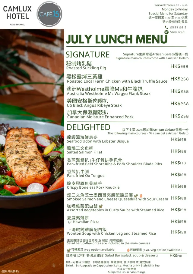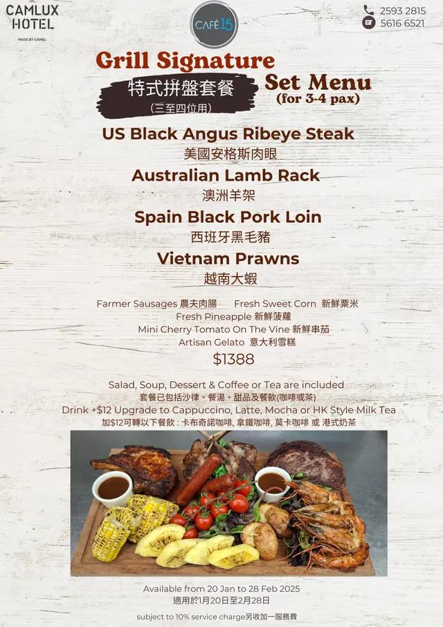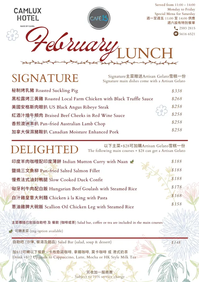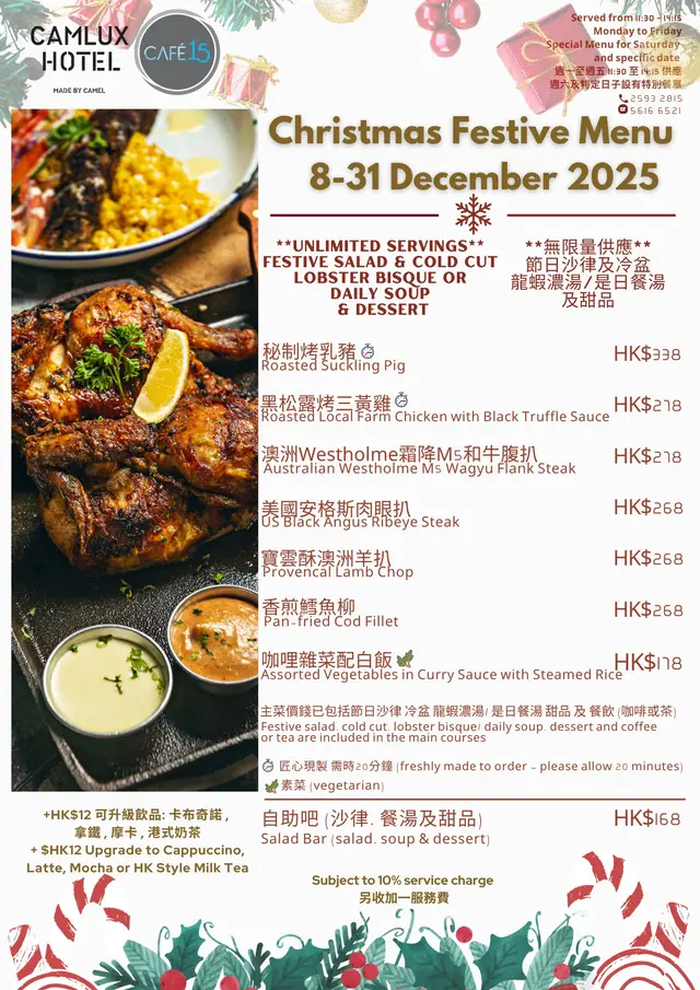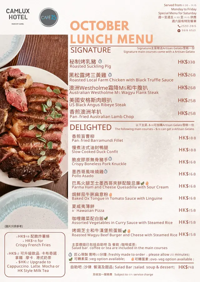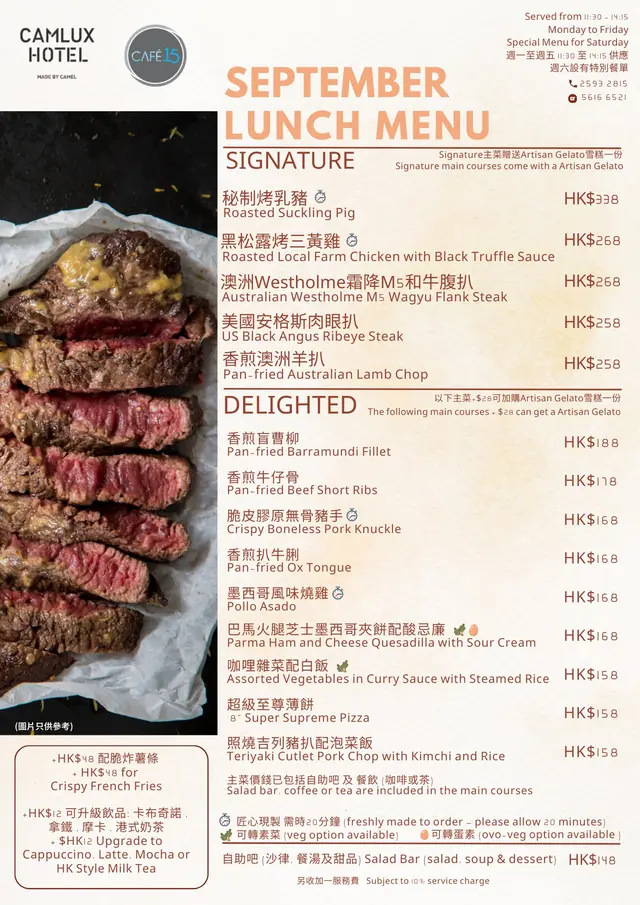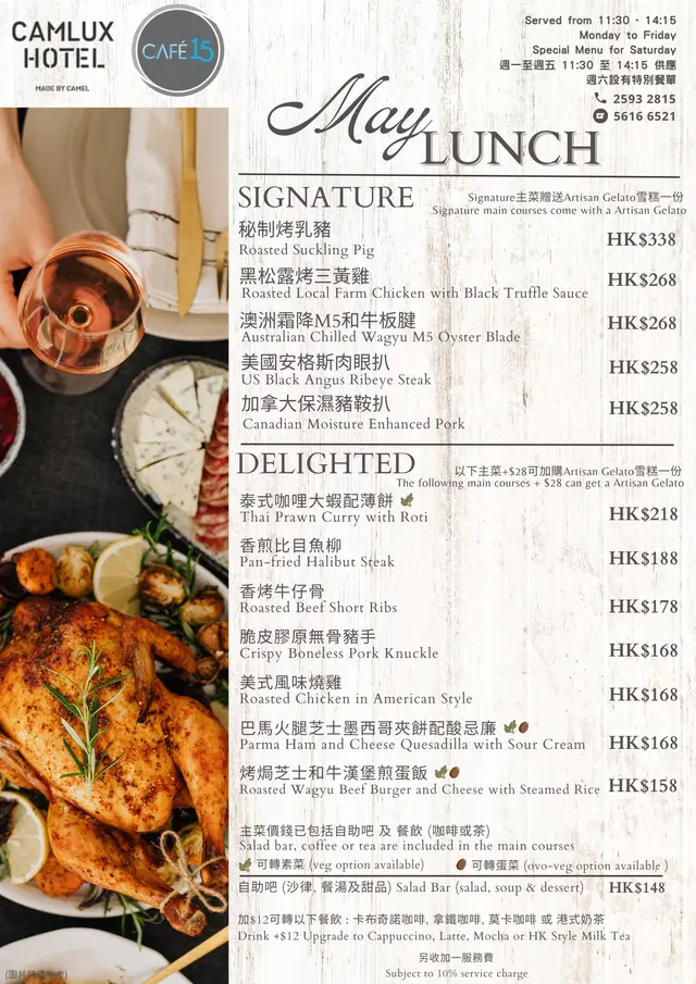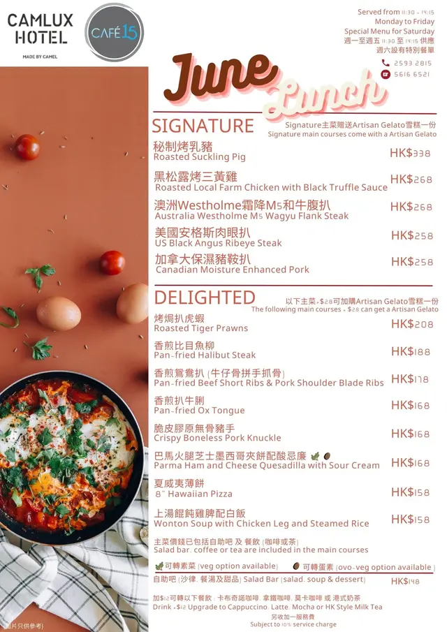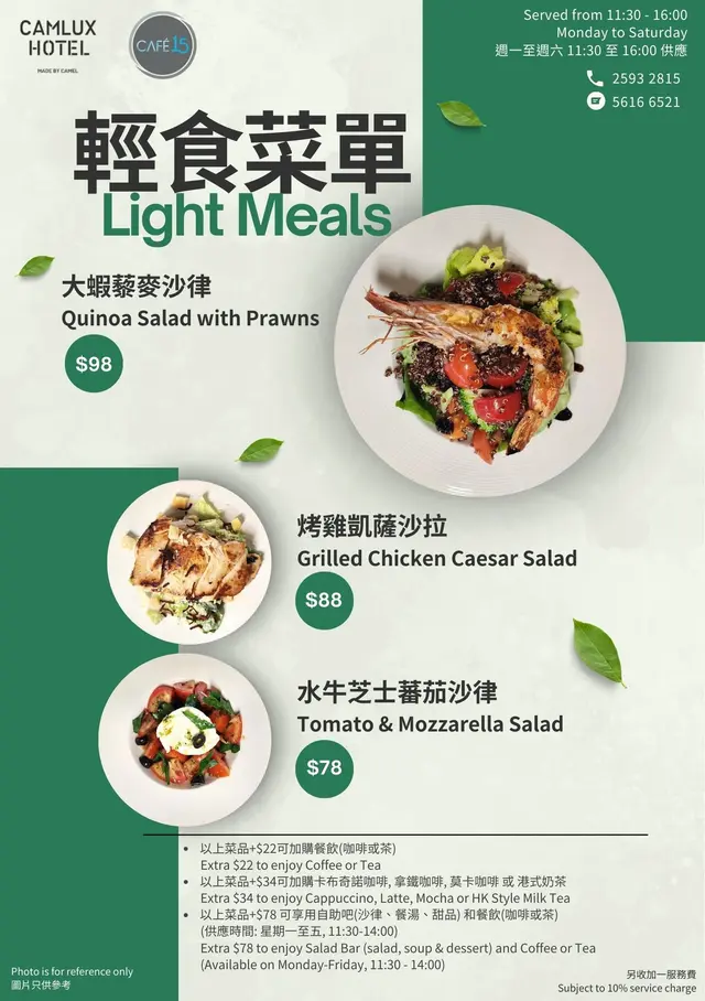 Café 15 (九龍灣) 網上訂座即賺Rice Dollars 網址: https://s.openrice.com/QrbS0vWi800 地址: 香港九龍灣宏光道15號君立酒店地舖 電話: +852 25932815