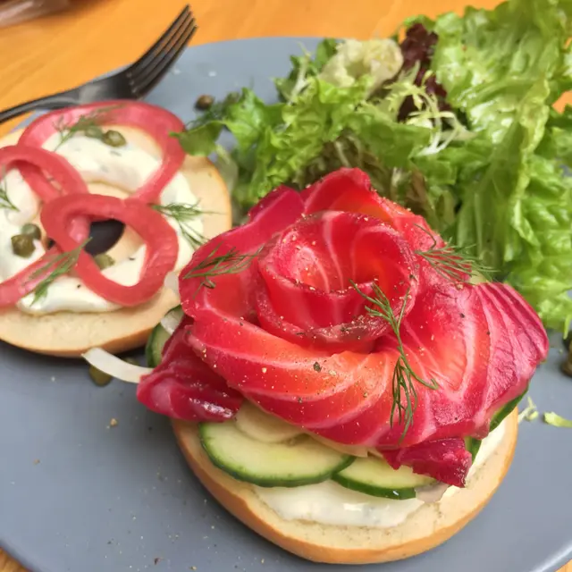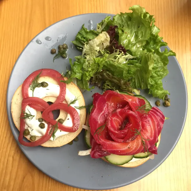 一個悠閒的下午,姐妹淘最喜歡是找一家cafe什麼都聊一餐,友人找的到達才發現之前已到訪過:)本想坐坐户外,但因有點小雨粉,同時户外沒開放,約下午2時30左右到達, cafe不大,只有一邊是座位,剛好有位不用等。餐牌是很特別,像Q card 摺疊著,但忘記拍照我叫了一個"house bagel" 和一杯latte 我是蠻喜歡bagel 跟cream cheese 這個配搭; 賣相有點簡單,但紅色三文魚很搶戲第一口感bagel 有點硬,其他味道都是酸的應該是檸汁太多,帶出三文魚有點腥,蔬菜夾雜不是十分新鮮。最後我是吃淨三文魚的如現在是流行拉花,那這裡不過不失:)Latte不太合我的味道,入口苦味太重整體感覺不過不失👌🏻查看更多