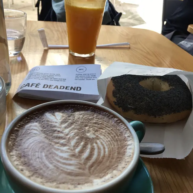 之前朋友介紹這間Cafe Deadend 環境不錯 而且食物質素高,前幾天就跟男朋友去試一下。我點了他們的homemade bagel,自家製bagel加了cream cheese、三文魚和青瓜,旁邊加上新鮮沙律菜。bagel上菜是還是暖暖的,外脆內軟,口感是在。個人覺得配上cream cheese非常好味,上面加了一點醃製過的洋蔥,酸酸甜甜,口感和味道一流!而且值得 一讚的是三文魚擺盤精緻,好似一多玫瑰花一樣在bagel上綻放,味道很好之外還能令人心情愉悅~好精緻啊!我點了一杯凍朱古力。他們的朱古力比較偏苦,多喝也不會太膩,女生不會怕肥呀我男朋友點了avocado toast 麵包上面鋪滿厚厚的牛油果蓉,配上流心蛋和車厘茄,他們的多士同樣口感厚實,不會像外面的”空氣麵包“,外脆內軟,配上牛油果和蛋漿非常好味,而且牛油果非常健康,這款也值得推展給女士們~ 旁邊的是雜莓yoghurt,原味的yoghurt不會太酸,配上雜莓醬酸酸甜甜,挺好吃的。綠茶latte奶味比較重,味道還可以。查看更多